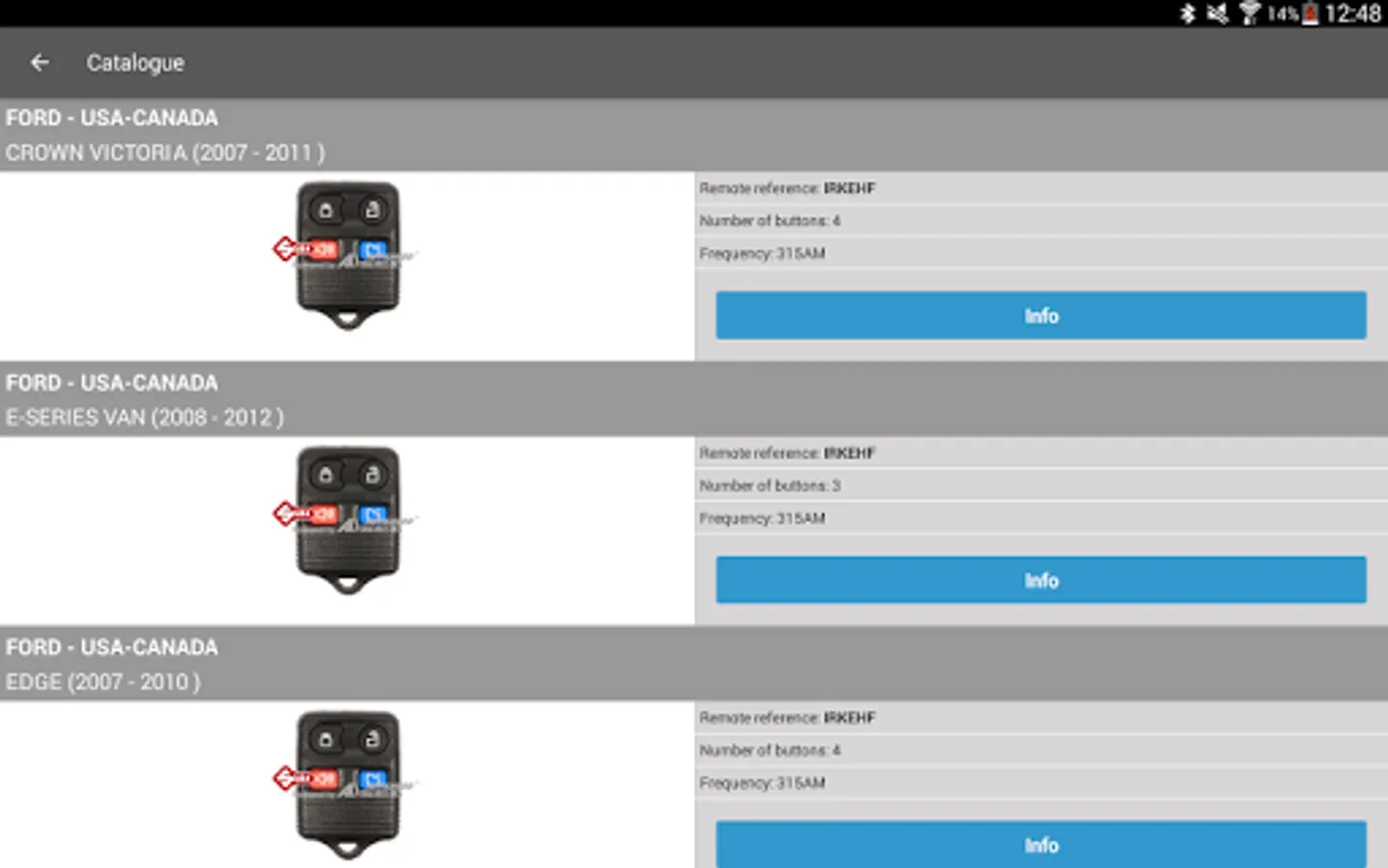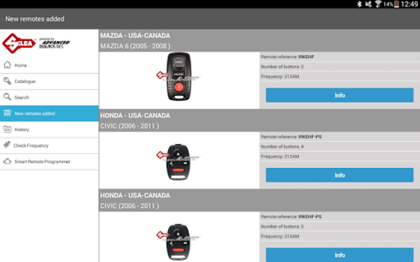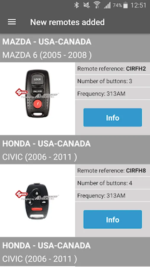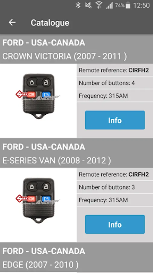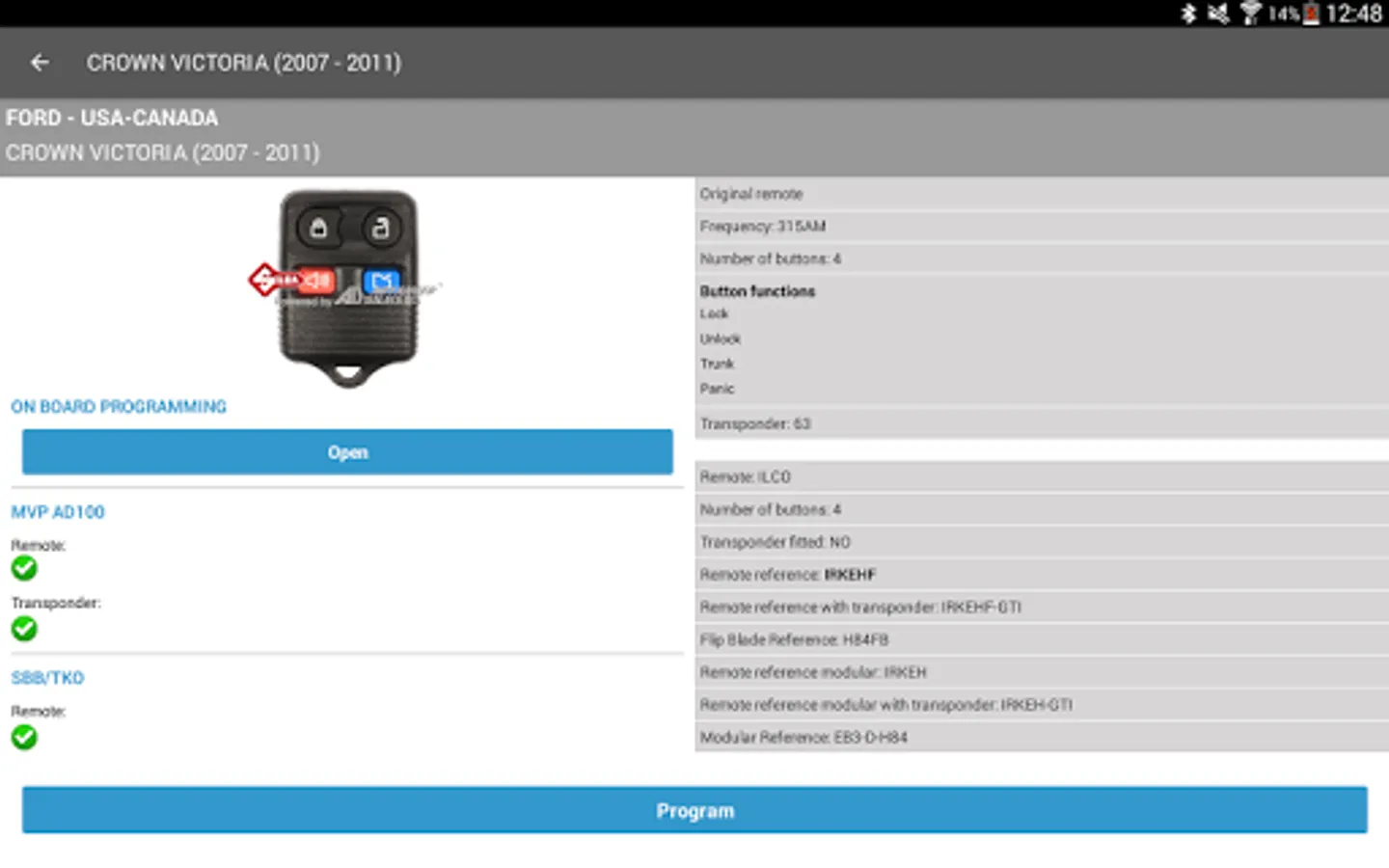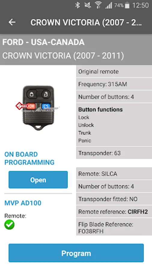 The software shows the right Silca Universal Remote Car Key reference, transponder and Silca CH key blade to use, and provides relevant information such as the remote frequency, the number and function of buttons.