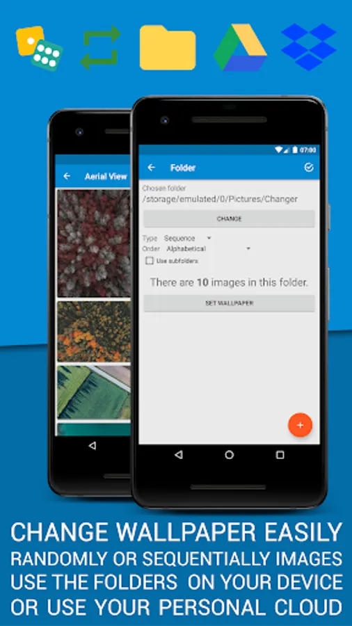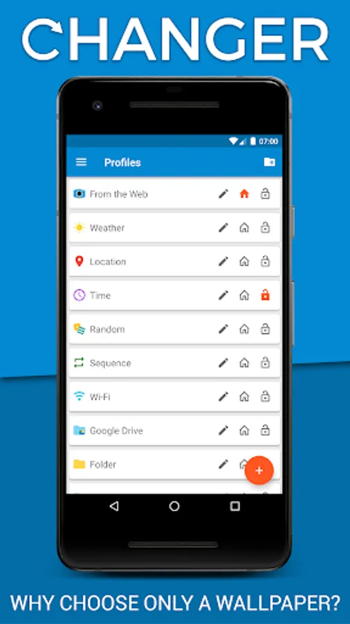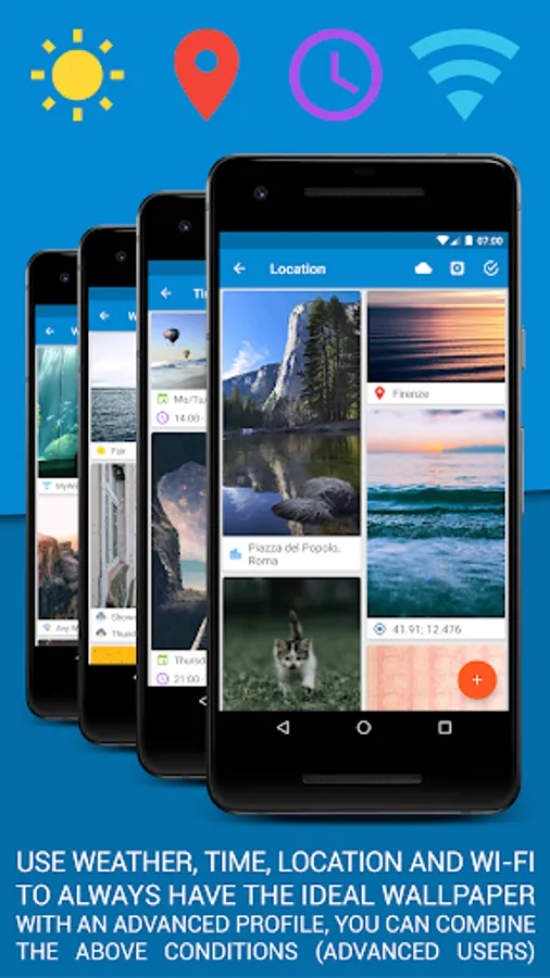 You can select your images and photos, which will be set as wallpaper according to your personal preferences. In fact Changer changes wallpaper according to the current weather, location, time or Wi-Fi or with random or sequential images, all at the user's choice.