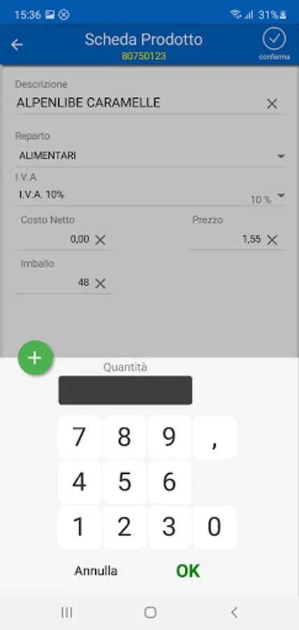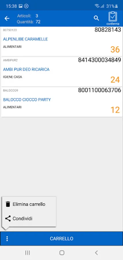 Uses the device's camera to read the bar code or the integrated scanner in case of professional terminalini use with Android operating system, allowing recording in a cart the amount of scanned products.