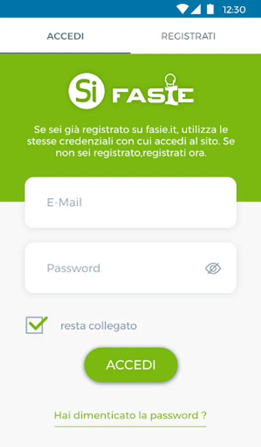 To access the Si FASIE app functions, enter the username and password that you already use to enter your reserved area of fasie.it. If you are not yet registered on the Fasie website, you can also register directly on the app.