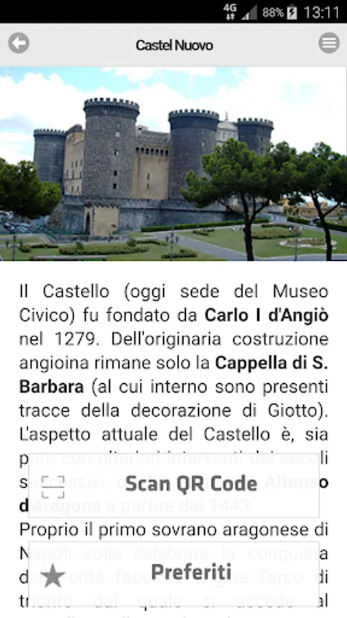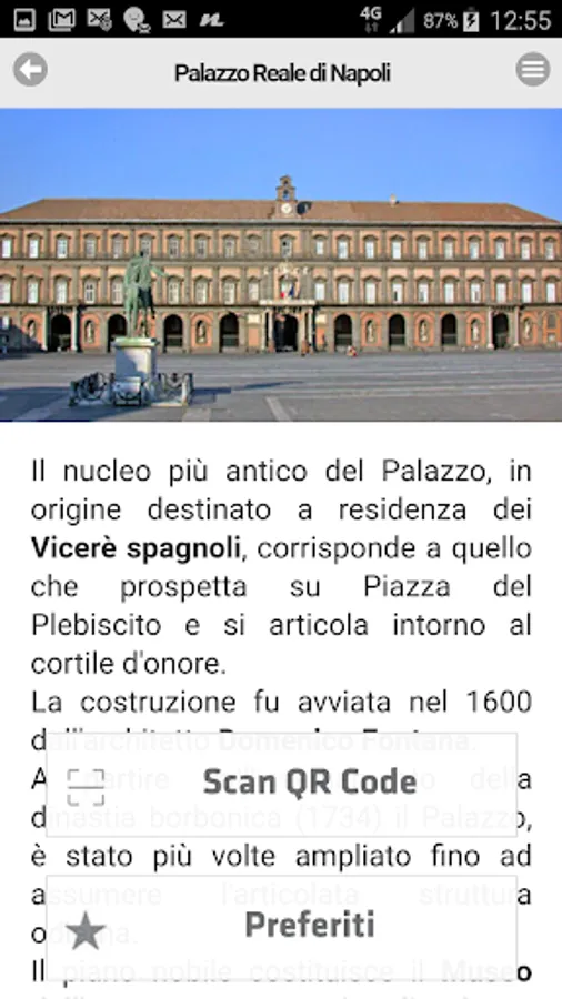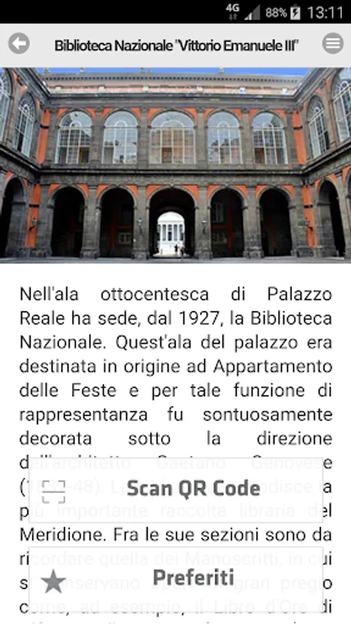Enjoy All Palazzo Reale was designed to be used exclusively inside the Royal Palace of Naples, the National Library "Vittorio Emanuele III", the Theater of San Carlo and Castelnuovo, scanning the Qr-Code placed in the rooms or next to the works , so as to obtain further information.