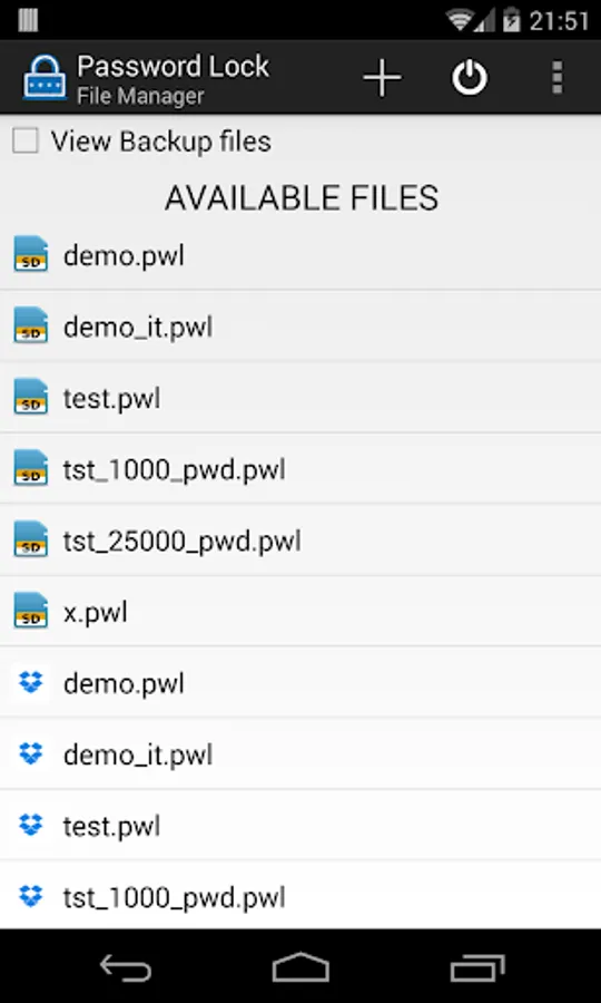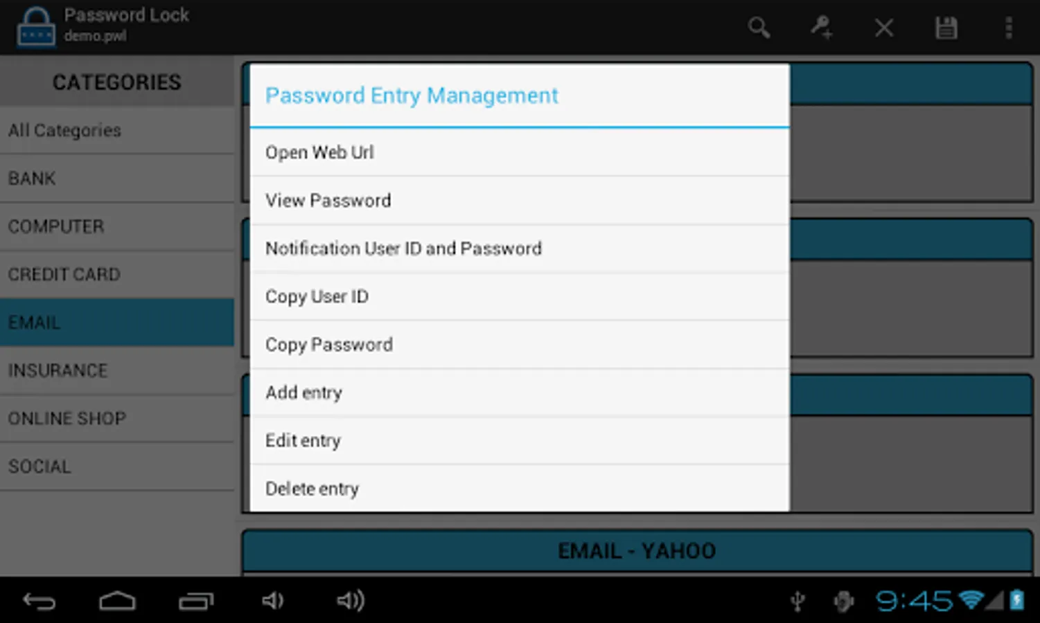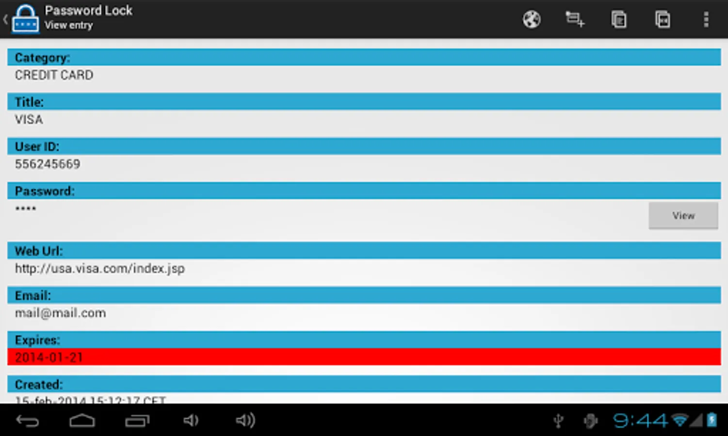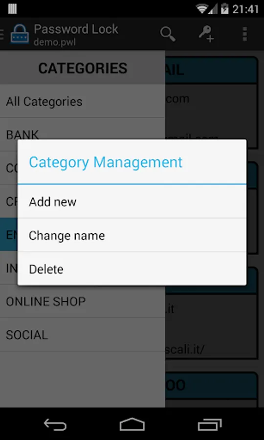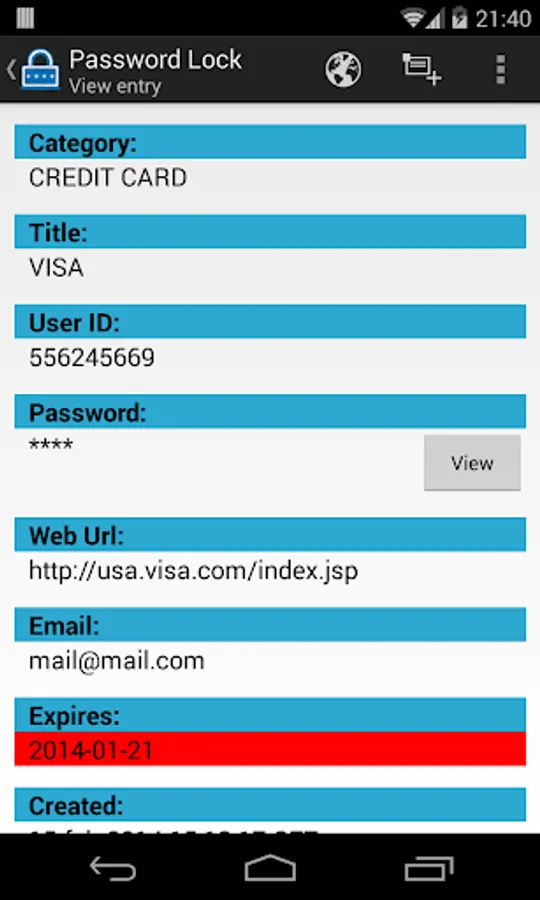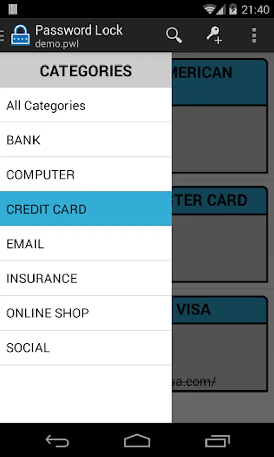 With Password Lock you can store and manage all your passwords, i.e. credit cards and ATM PIN codes, ID and USERS codes in a single encrypted file which can be read only from you both through your Android device and through your PC with an also available free multi-platform Desktop version which runs on Windows, MacOsX and Linux.