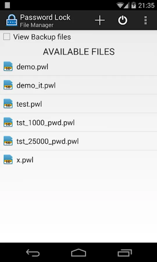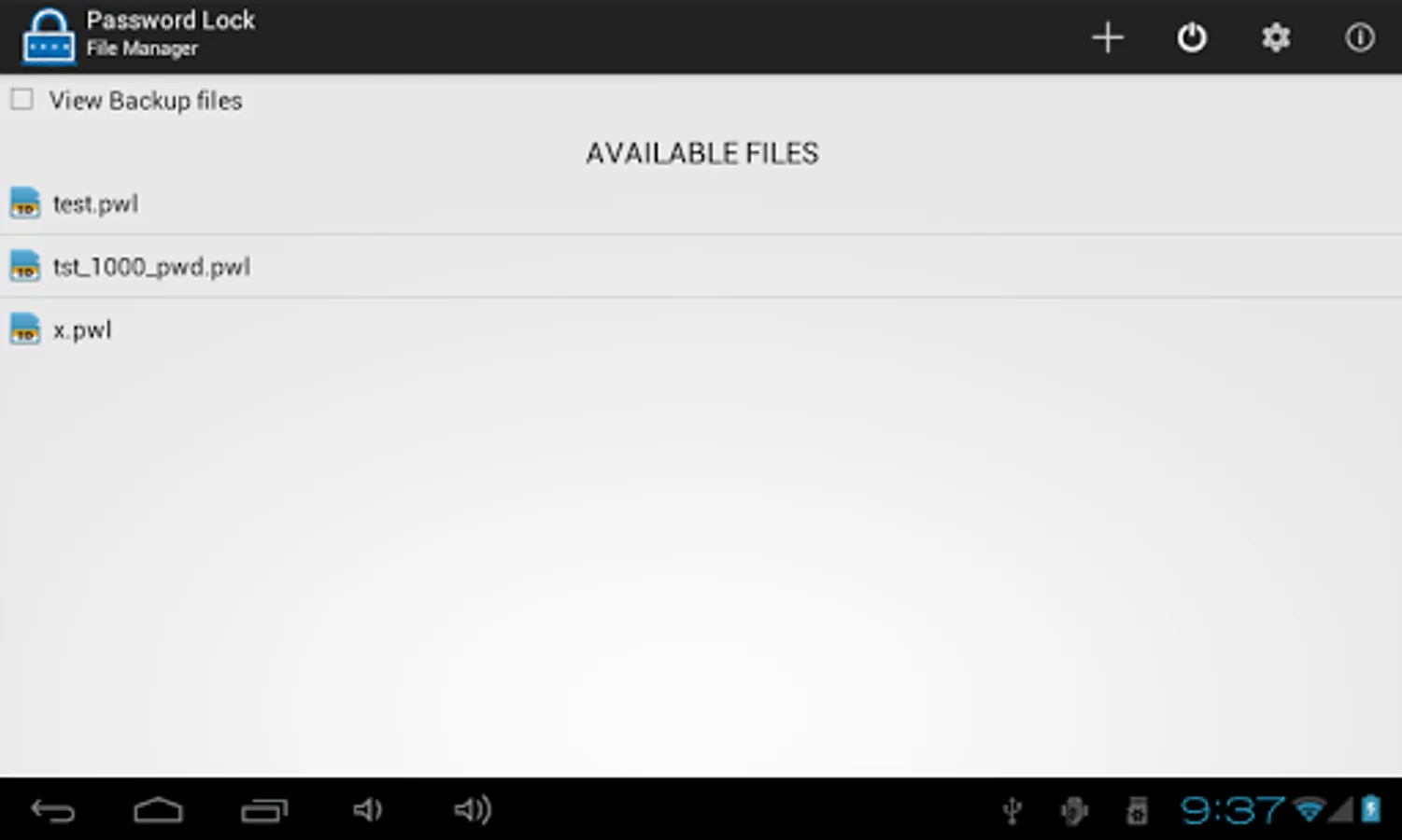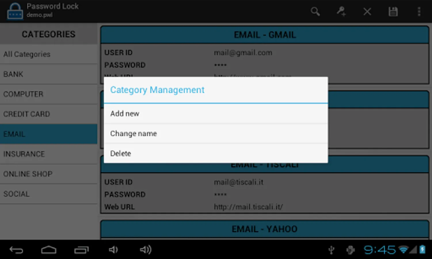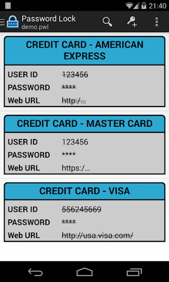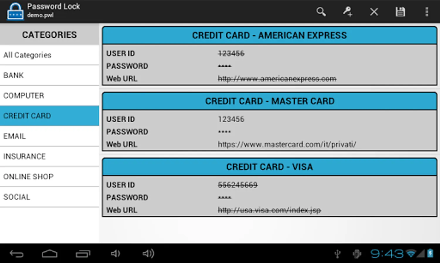 With Password Manager (Password Lock) you can store and manage all your passwords, i.e. credit cards and ATM PIN codes, ID and USERS codes in a single encrypted file which can be read only from you both through your Android device and through your PC with an also available free multi-platform Desktop version which runs on Windows, MacOsX and Linux.