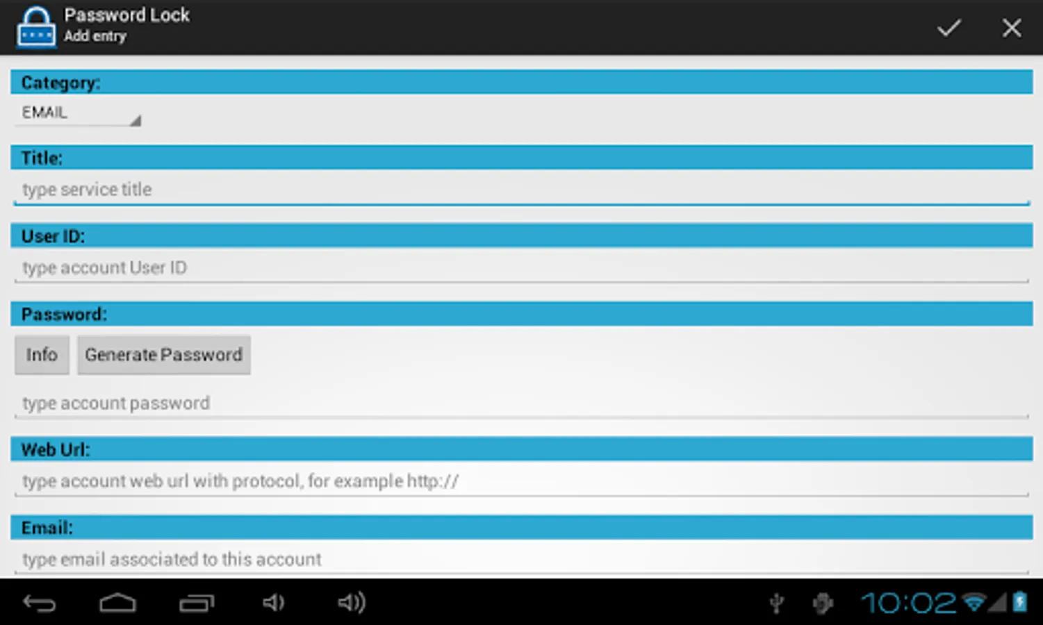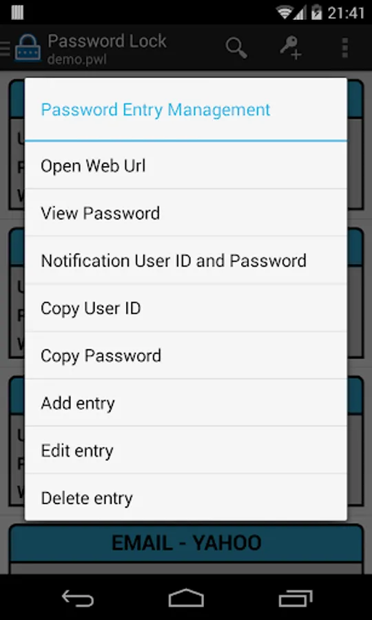 - You can start the browser with the precompiled Website field directly from the selected password, copying User ID and Password in the clipboard or using Android notifications to later copy User ID and Password in the clipboard;