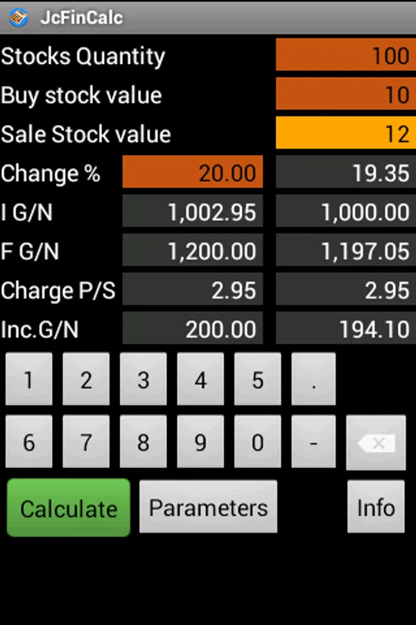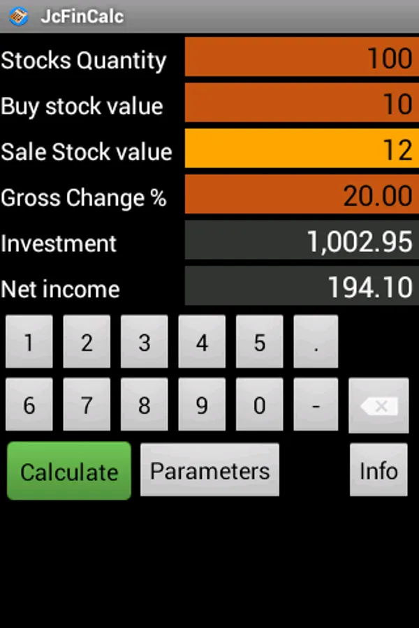JcFinCalc is an easy application which calculates the return of a stocks investment on the base of heir sale value or their percentage fluctuation.