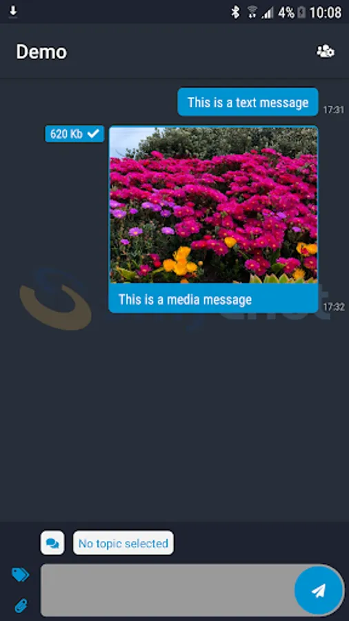 You can send textual messages and attach medias (pictures, videos, files) to all members of a chat group or to a specific user (1:1 chat).