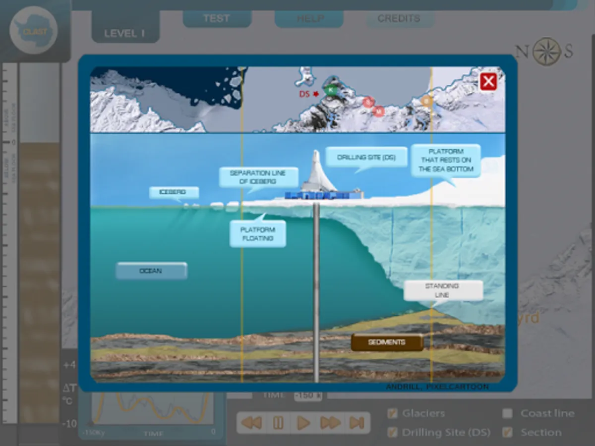 CLAST it’s a complete educational tool too. The student and teacher worksheets (freely downloadable on the app website) help to adopt it immediately in the classroom during science lessons. Students can explore autonomously the relations among the different elements of the environment and grasp the methods adopted by ANDRILL scientists.