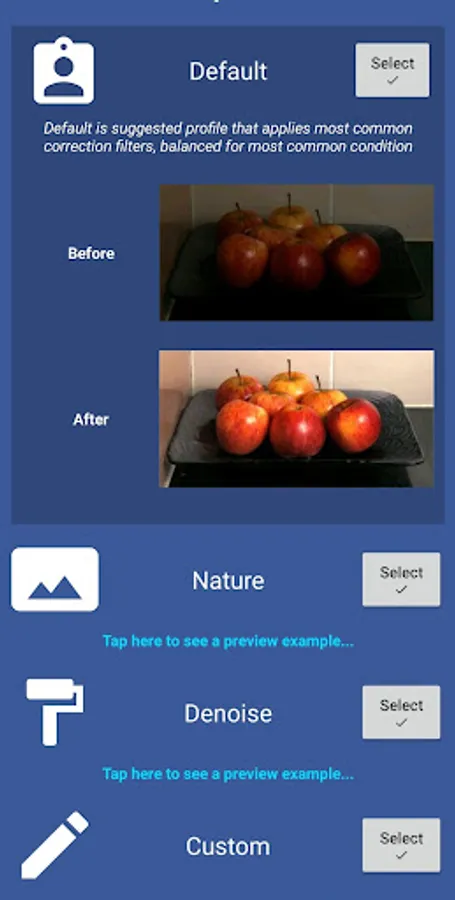 -Custom: here you can enable and configure your favorite filters. By default, this profile produces more brightness and sharpening, so it is also recommended for those who want a stronger result than the "Default" profile