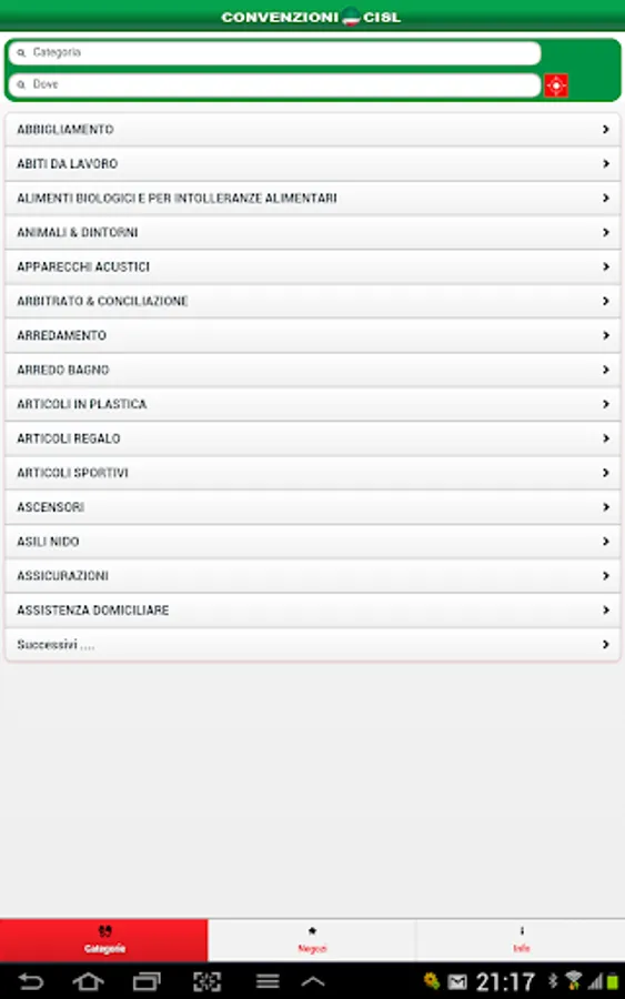 CISL Conventions (Updated version 2019) is an APP dedicated to all members of the CISL Syndicate. It allows you to quickly find all the shops and companies that practice discounts and subsidies (especially in Piedmont, but other conventions valid throughout Italy are added periodically) to members and their families, in many product categories (eg clothing, insurance, banks, cars, rest homes, health and wellness, opticians, dentists, books, travel agencies, hotels and tourist villages, etc.)