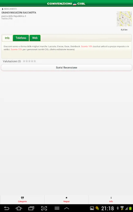 It is possible to search by category, product or company name, therefore, once the point of interest has been identified, the following are displayed: the description and the products / services sold, the discount applied and the contact info (website, telephone, mail etc) and, thanks to the gps of the mobile device, the APP can also provide a map and directions to reach it. You can also view images and videos related to the store.