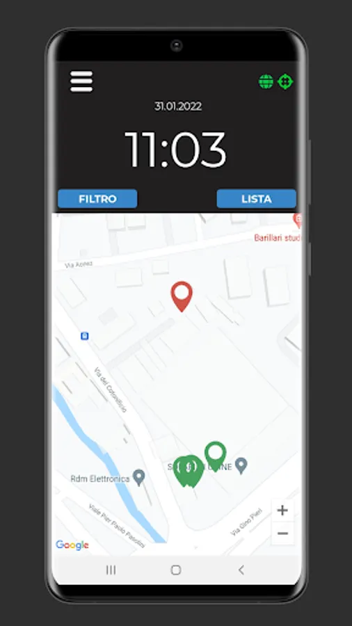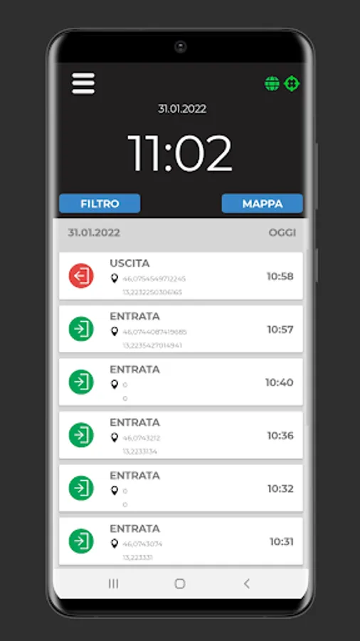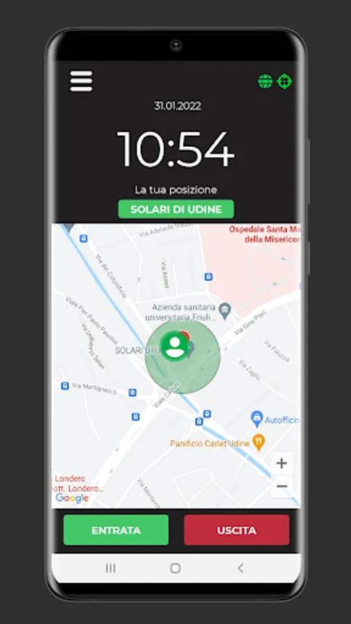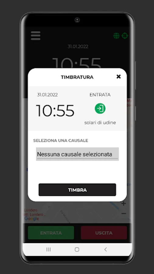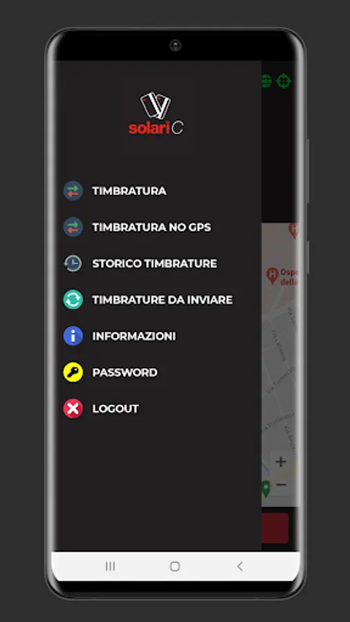 SolariC .in/out allows you to carry out geolocalised and/or BLE stampings on Solari terminals. You can clock in or out by possibly selecting a reason. The stamps are then imported into StartWeb, from where they can be corrected according to the chosen configuration. Also from StartWeb it is possible to define geolocated virtual terminals and highlight the stampings made outside these areas.