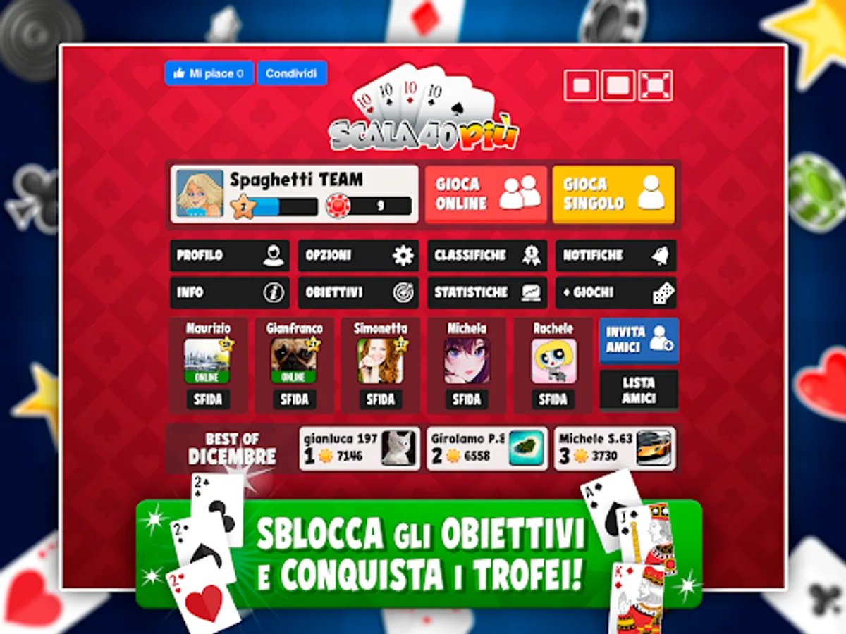 Play Scala 40 Più online completely free, your enjoyment is guaranteed! Private messages, chat, monthly trophies, badges, personal statistics and much more awaits you!