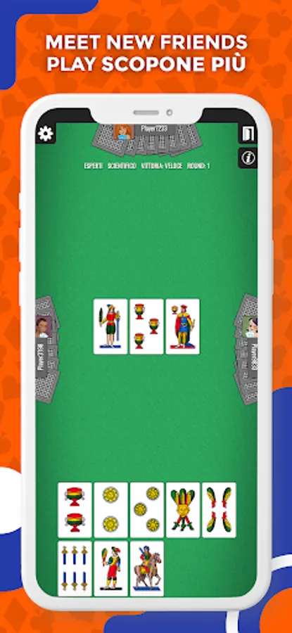 Play from your smartphone or tablet, in horizontal or vertical mode, Scopone Più will win you over with its speed, fluidity and precision. You will feel as if you´re playing with your friends! Start playing directly without even registering or log in via Facebook®, Google® or email to play the social and competitive matches!