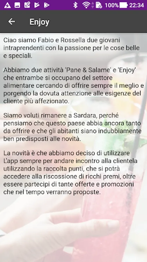 We have two activities 'Pane & Salame' and 'Enjoy' that both deal with the food sector trying to always offer the best and paying due attention to the needs of the most loyal customer.
