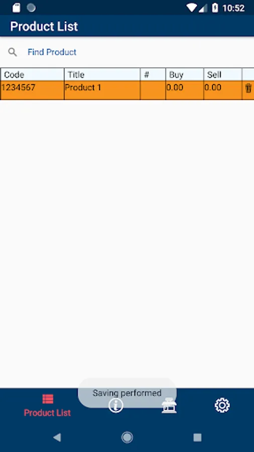 The first screen is the list of saved products (ordered from smaller to larger quantities) with the following details displayed: