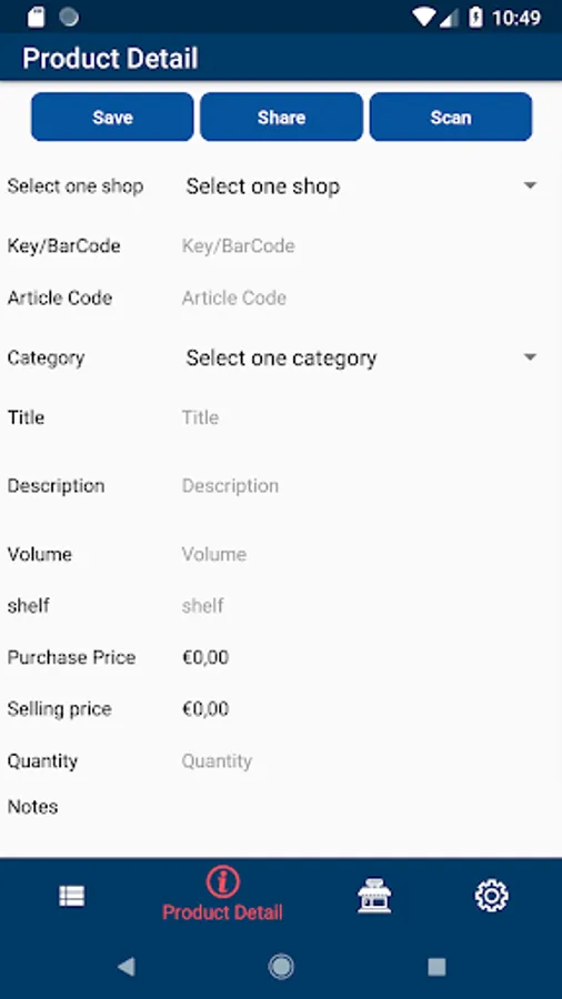Simple inventory application, with the possibility of scanning barcodes and QRCodes or entering an identifier of your choice, entering the stores and detailing the product. It is possible to send via BlueTooth a single product or all the data to another device that can retrieve the information from the "Import Data from Folder" function in the "Settings" tab.