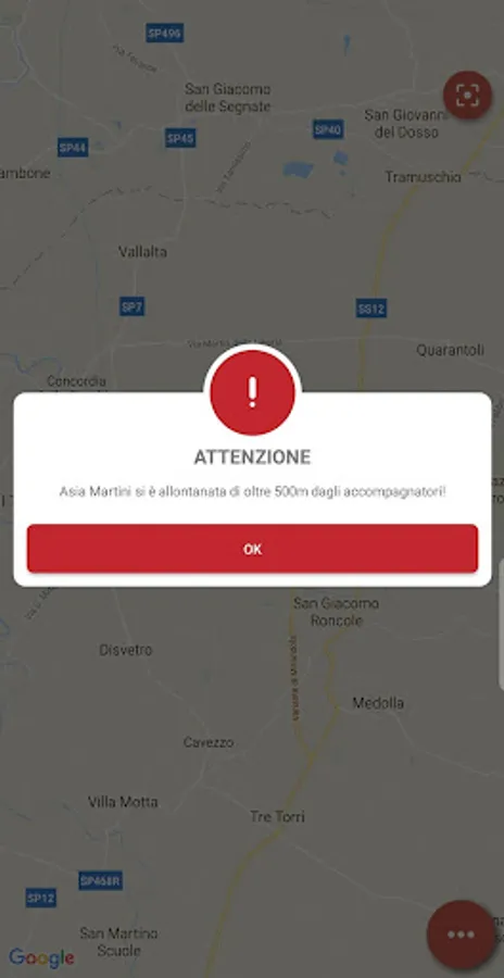 Participants at the exit, identified by the name of the person who is assigned to the device. If the person moves away the accompanying person receives an audible warning and a text message warning him with an alarm. A geomappa guides him to the point of localization and discovery.
