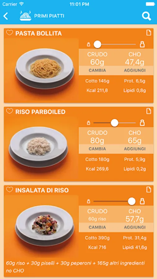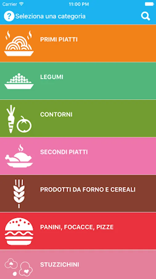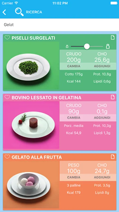 Foods are divided by category, within each there are the cards of various foods with explanatory photos.