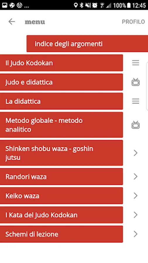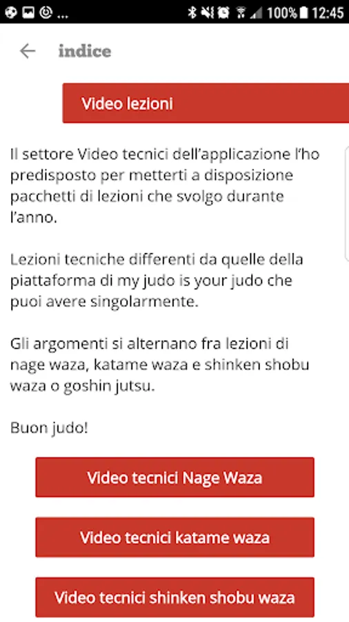 In this way, for example, if you are looking for the kaeshi waza of o soto gari it will be sufficient to enter the index of topics, touch the ashi waza button, touch or soto gari and the tutorials that interest you will appear.