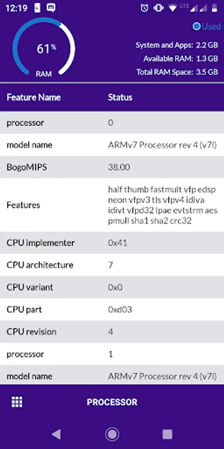 »Processor, Bogo MIPS, Features, CPU Implementer, CPU Architecture, CPU variant