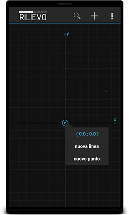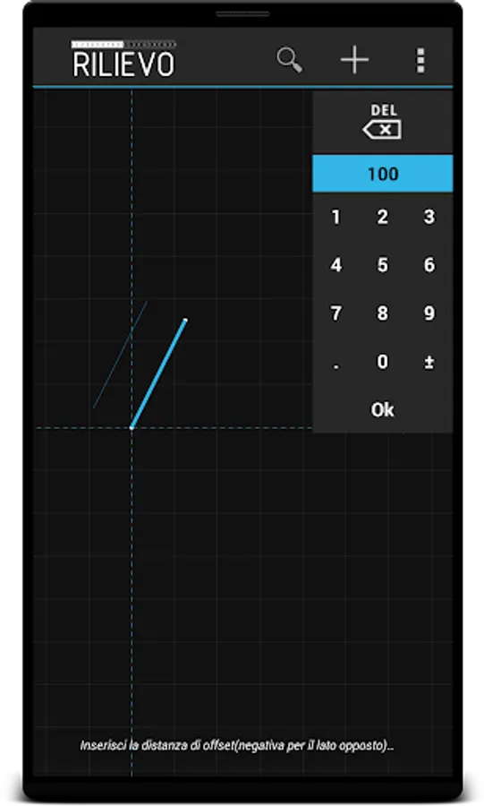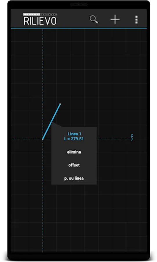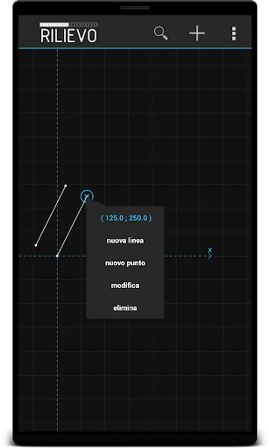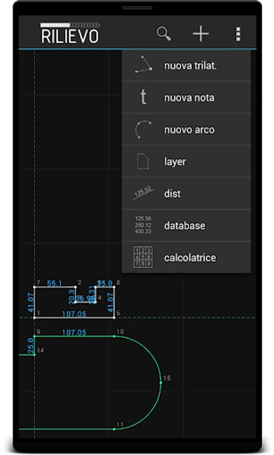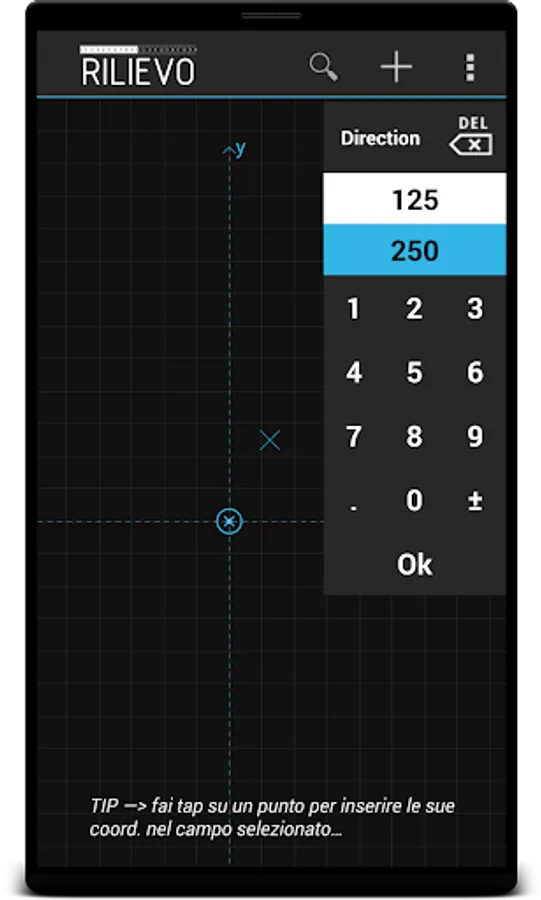 Just open the application you find the first point already inserted. By tapping on the point 1 is opened the context menu with the buttons for the next point or line. Using the keypad you can enter the relative coordinates or press the "dir" button to indicate the direction.