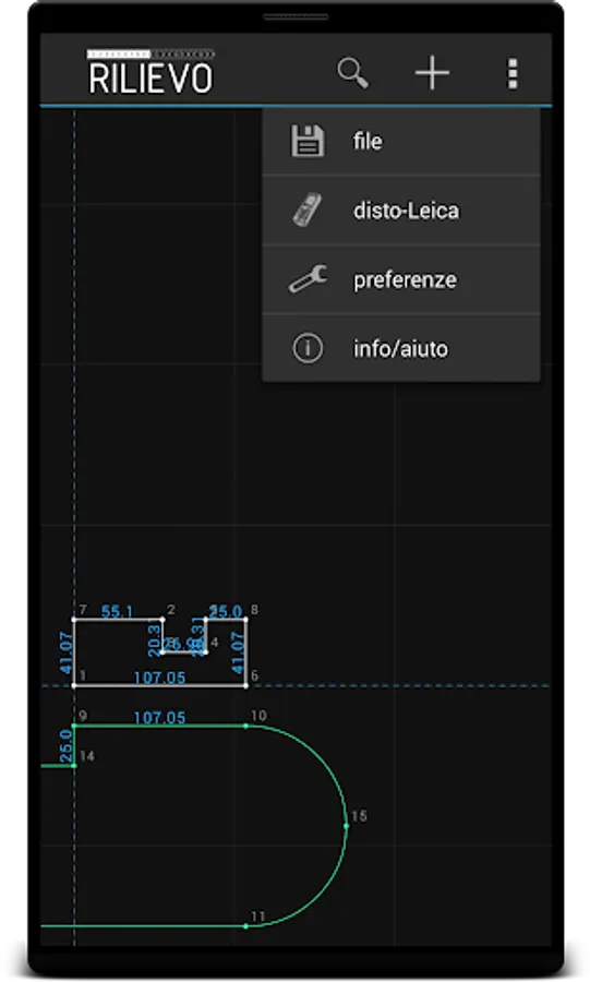 The app store the survey in DXF format into an external storage folder named "Rilievo". You can also to IMPORT simple DXF external file into drawing.