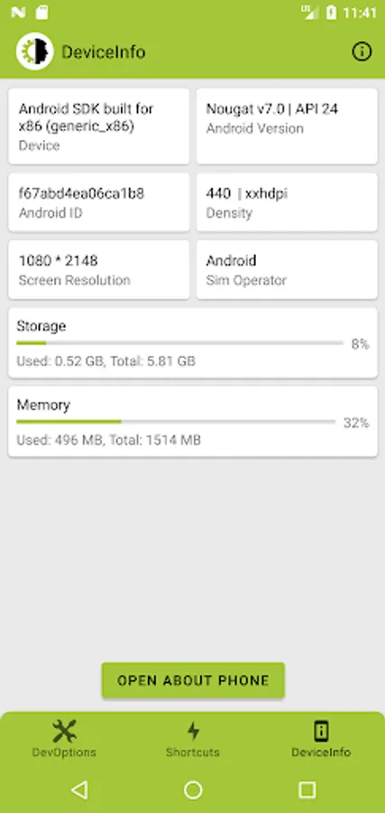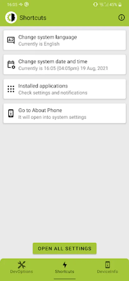 Moreover there are some shortcuts to help you reach the main settings and some information of your device that can help you developing your application.