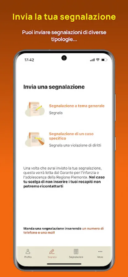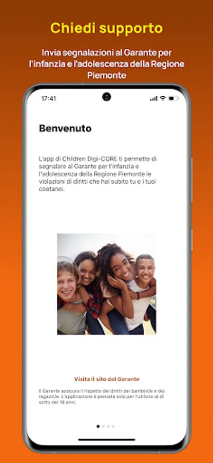 A mobile app for children to be more aware of their rights, to understand when to turn to their help to help them support children and adolescents in the Piedmont Region. The application, by sending a report, allows children to contact the Ombudsperson for Children the Piedmont Region from their mobile phone, even anonymously, supporting them in identifying useful information for reporting.