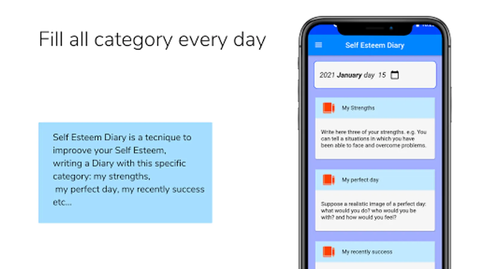 like a tecnique to improve your Self Esteem, writing a mobile Diary with this specific category: "my strengths", "my perfect day", "my recently success", "Features that make me one of kind", "Three decisions of today", "Important people of my life", "Positive event happened today".