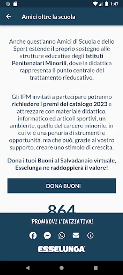 Customers will be able to donate the Good Friends of School and Sport to the virtual piggy bank through this App. Also in this edition, Esselunga will double its value!
