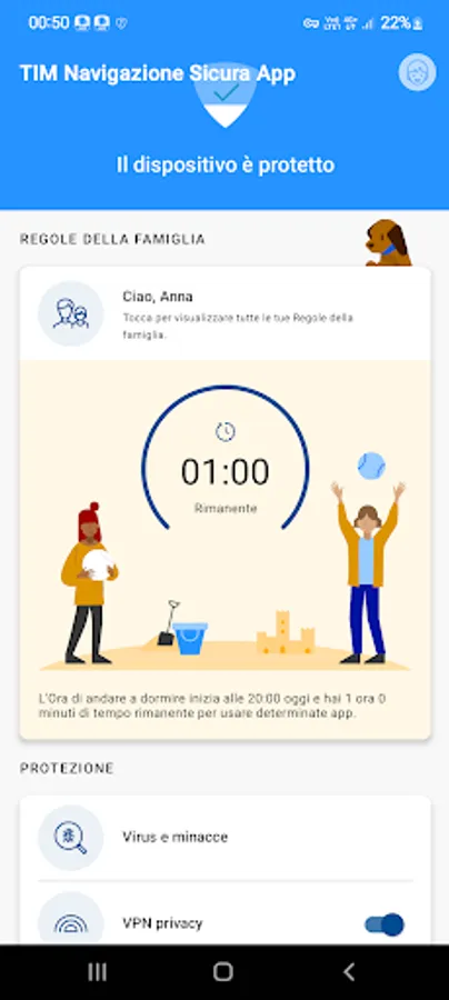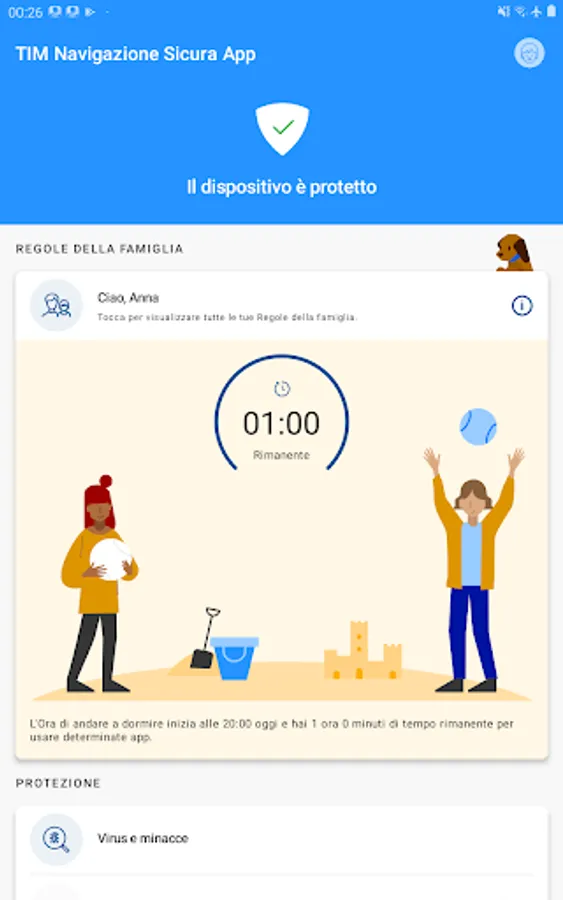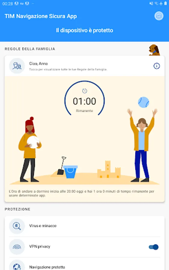 TIM Navigazione Sicura APP is the application developed in collaboration with F-Secure (world leader in IT security) that offers the most complete protection you could wish for for your smartphone or tablet. It is simple to install and does not slow down the performance of your device. To use TIM Navigazione Sicura APP it is necessary to purchase licenses on the tim.it website or in TIM Stores. The license is included free of charge in some offers such as the new TIM Junior, the TIM offer designed for children up to 16 years of age.