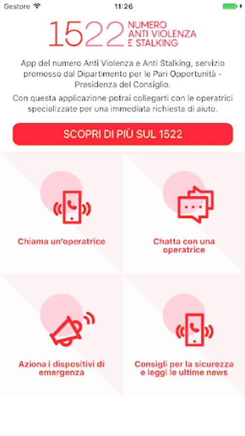 App of the number Anti Violence and Anti Stalking, service sponsored by the Department for Equal Opportunities - Presidency of the Council. With this application you can connect with specialized operators for an immediate request for help.