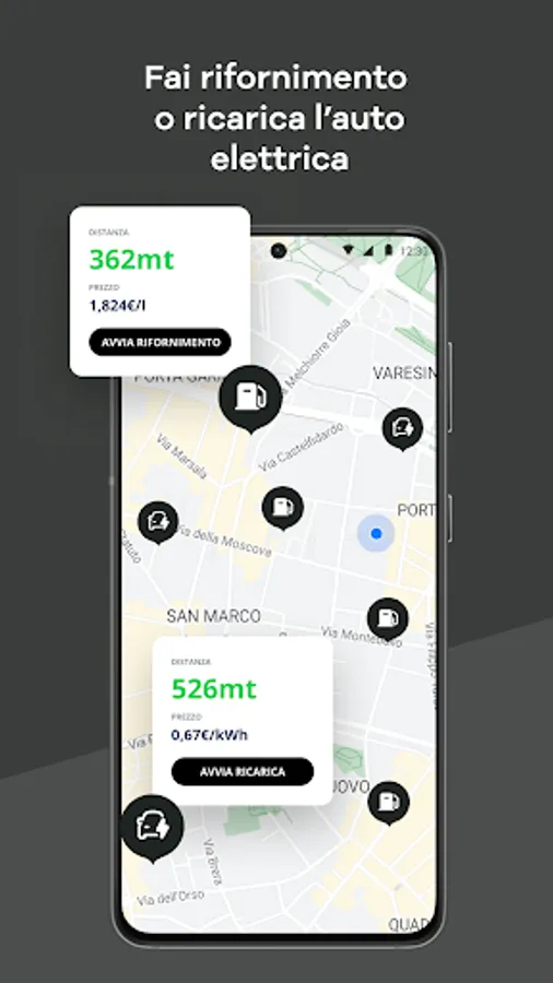 - Pay for petrol, diesel, LPG, methane and electric top-up directly in the app