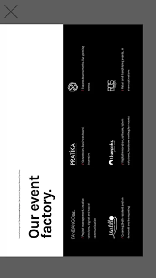The business idea at the heart of the Campus is to offer a full strategic advice to the client, minimizing outsourced activities. The Group's companies are its commercial engine Fandango Club, in charge of project management and creative team. Inside the Campus find space a catering company, Blueberry; one that follows the technological part of all our projects, The Rocks; a tour operator that deals with finding and contractualize locations for events, Pratika; one dedicated to the gaming world and Esports, PG Esports and specializes in retail and franchise events.