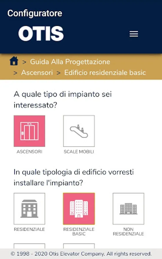 By simply indicating the type of building in which you want to install your system, its stops and the region / province of installation, the Guide will lead you to the correct selection of your system, in terms of type, size, speed and accessories, taking into account all the regulations in force at national and local level, the quality of service required and Otis' experience of over 165 years in the sector.