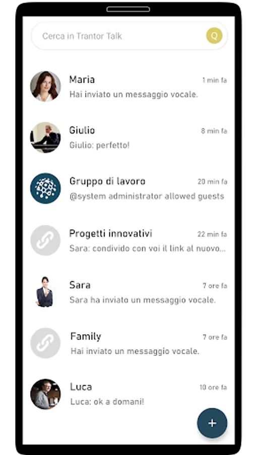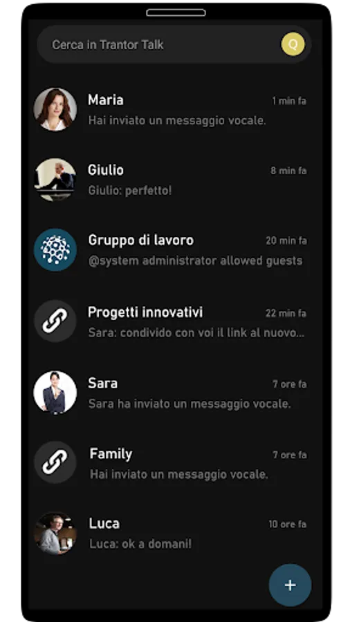 Trantor® Talk guarantees that all messages exchanged between users are rigorously encrypted with state-of-the-art systems and pass only and exclusively through the dedicated Trantor® server. No external person will be able to intercept user communications.