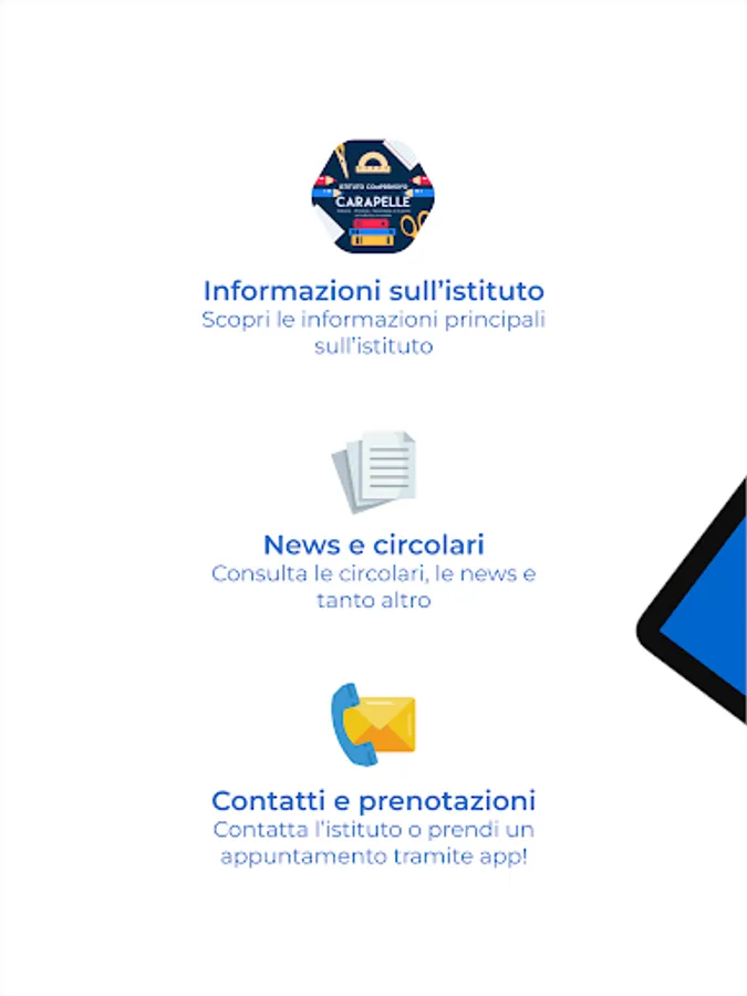 Discover the app of the Istituto Comprensivo Carapelle. You will be able to view all the information and contacts of the institute, consult the contents, receive push notifications based on your role and your interests, access the digital counter and book an appointment with the secretariat or the presidency.