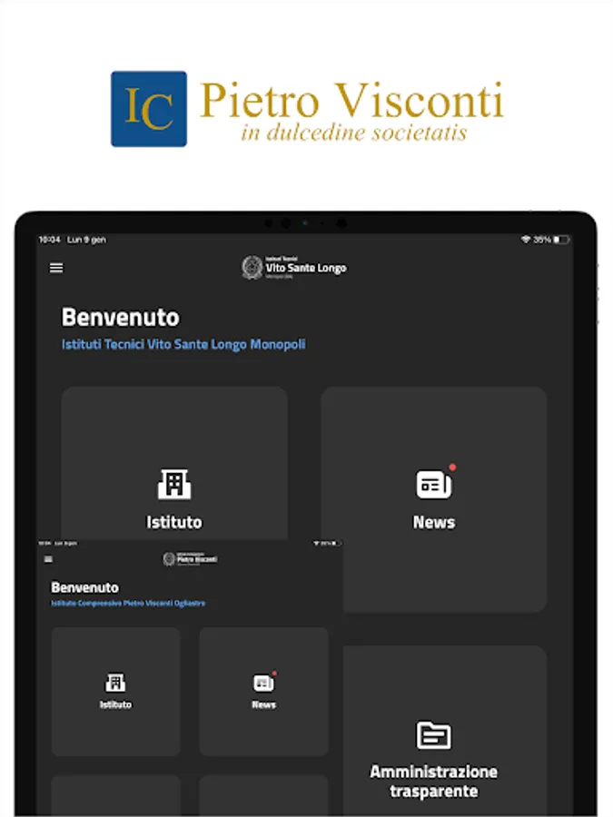 Discover the app of the Pietro Visconti Comprehensive Institute of Ogliastro Cilento. You will be able to view all the information and contacts of the institute, consult the contents, receive push notifications based on your role and your interests, access the digital counter and book an appointment with the secretariat or the presidency.