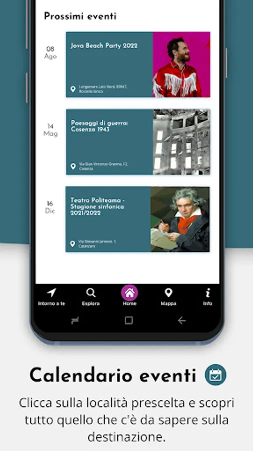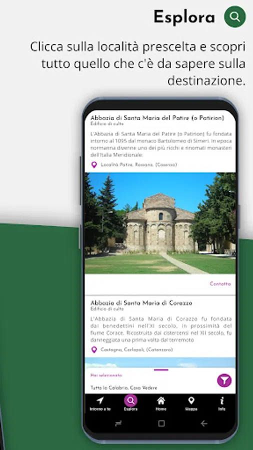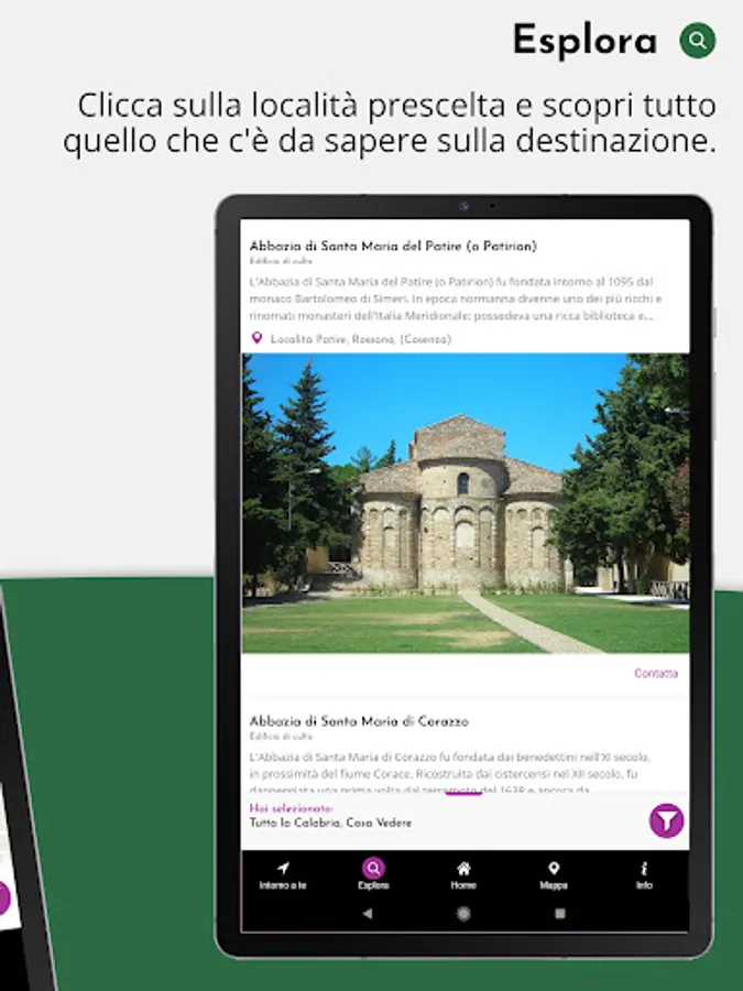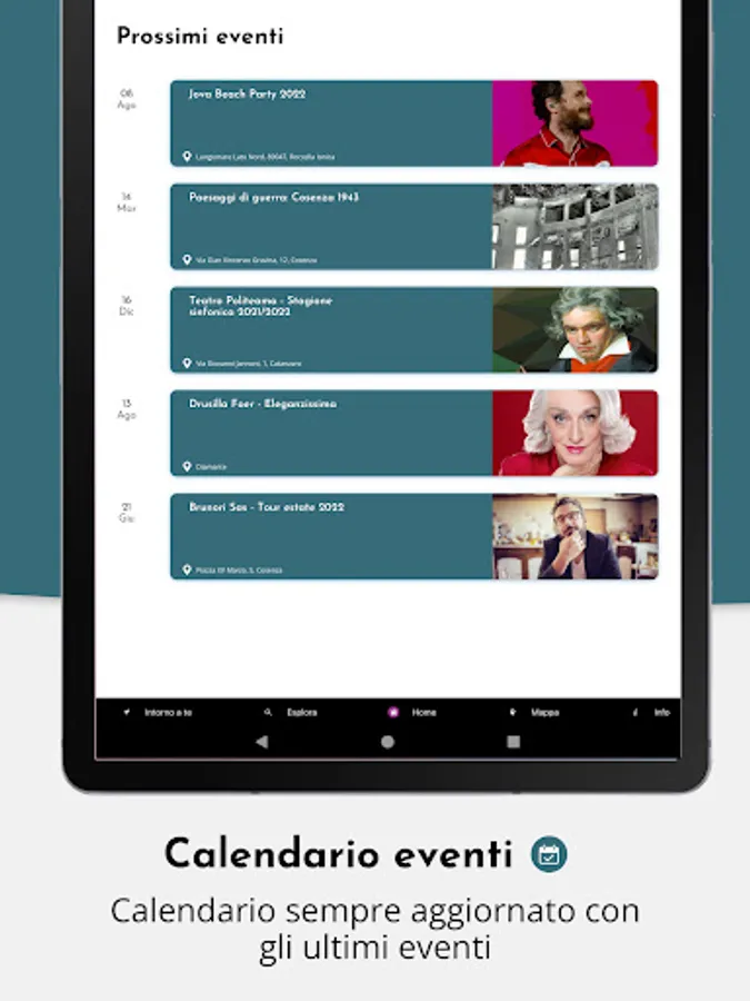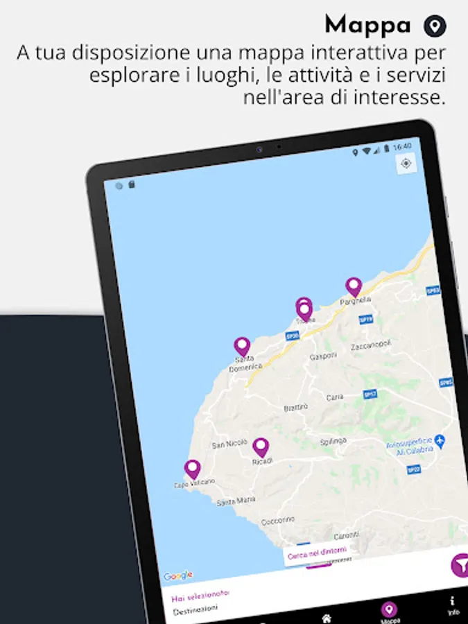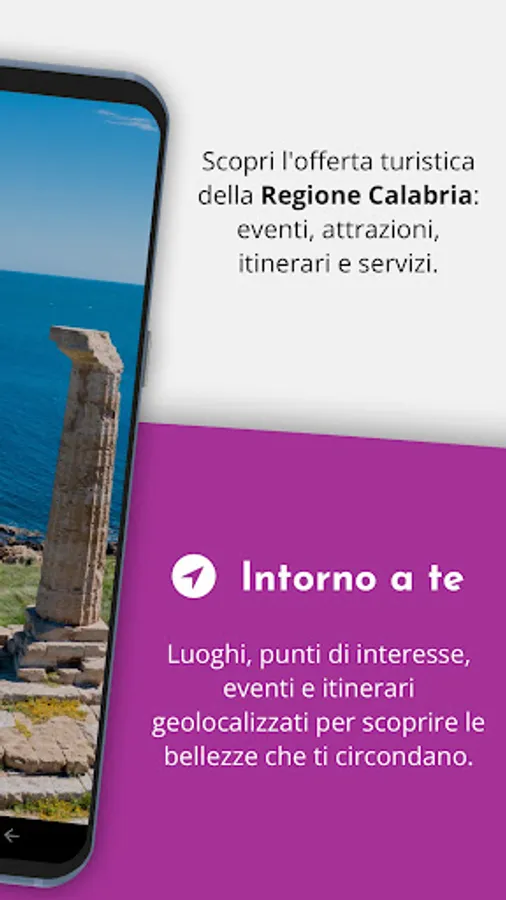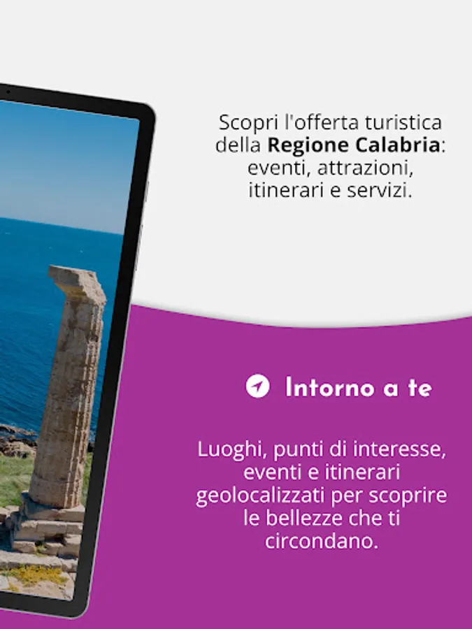 The Calabria Extraordinary App puts the tourist and cultural offer of the Calabria Region at your disposal: complete events calendar, geolocated and updated in real time; places of culture and points of interest with descriptions and useful info; inspirational editorial content for each destination; geolocated itineraries to plan excursions throughout the territory; logistical info and services, such as the list of hotel facilities, restaurants and tourist guides.
