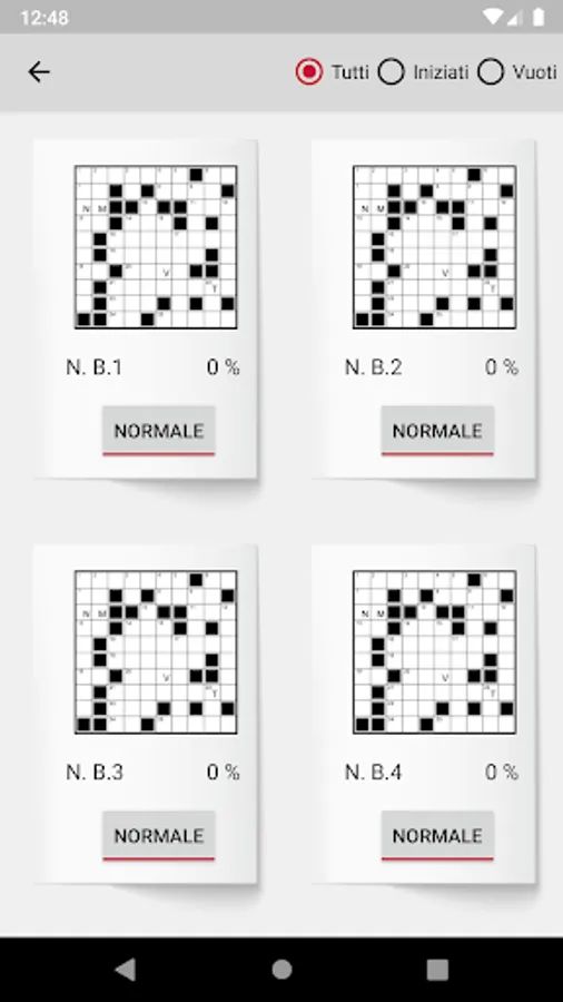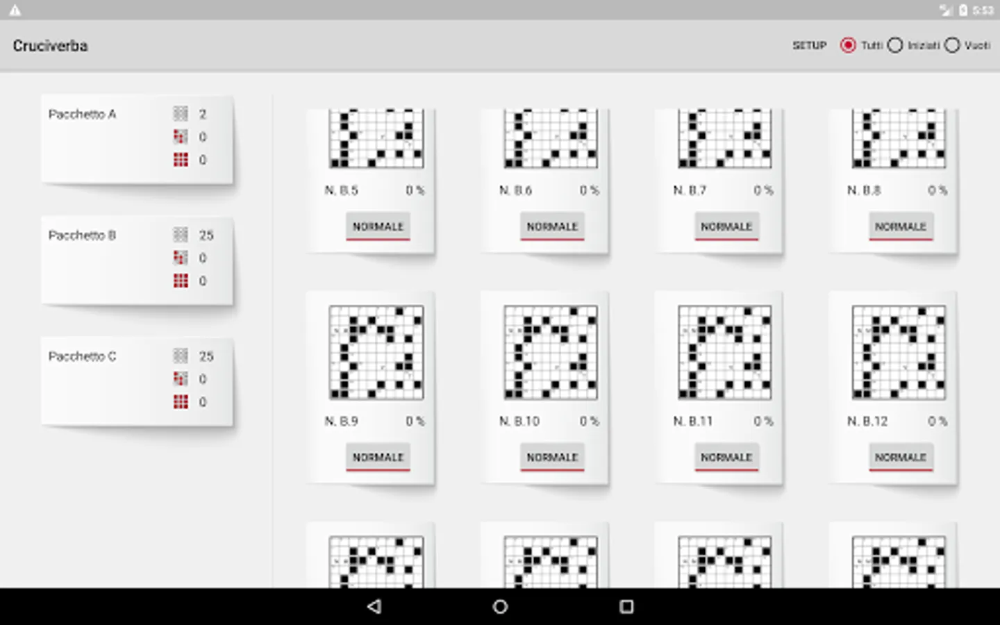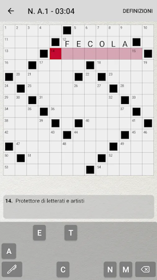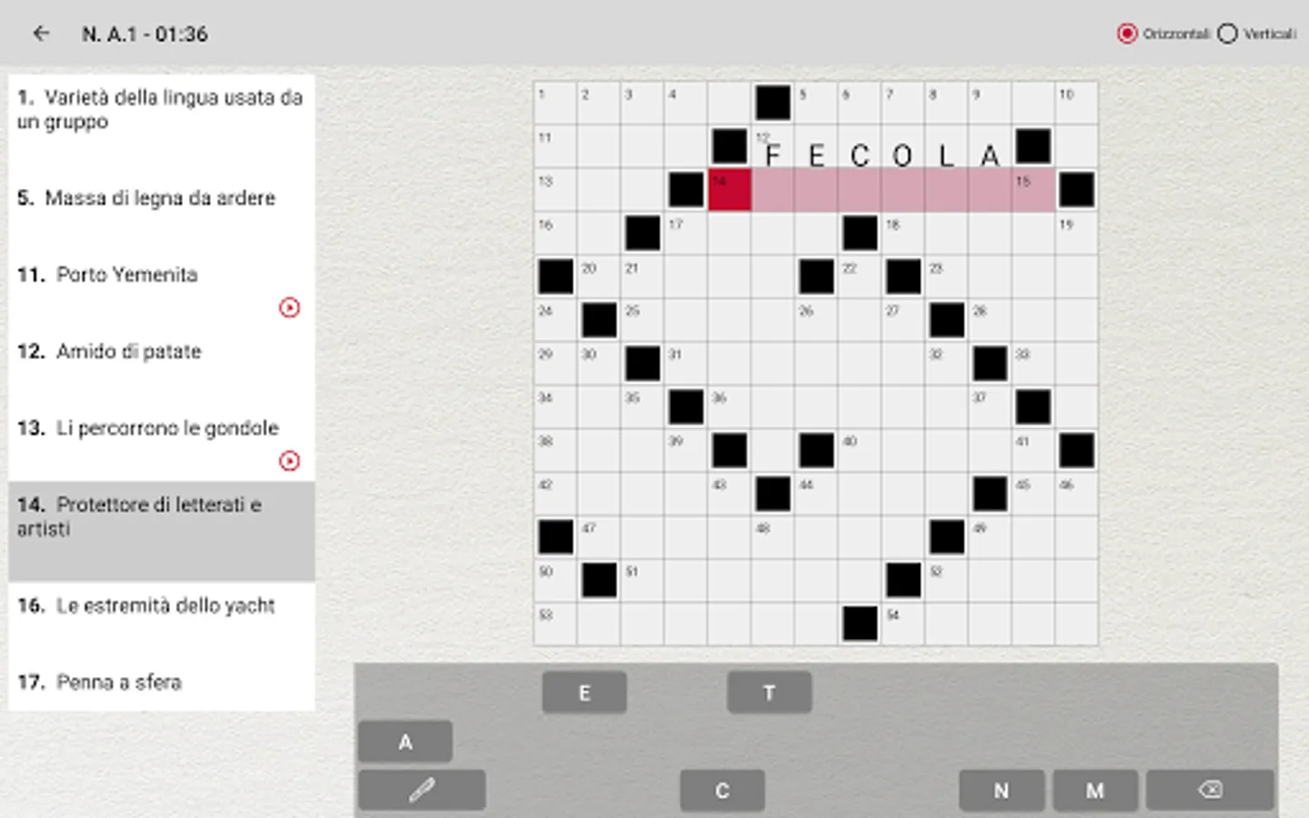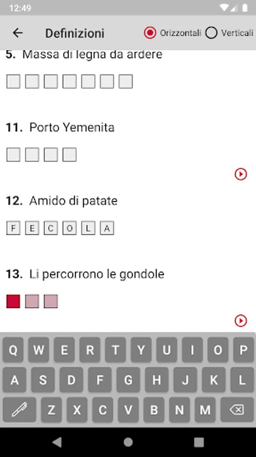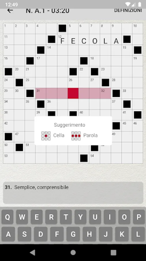The word is for everyone: for each scheme you can choose between two levels of difficulty: normal and easy. In easy mode the keyboard displays only the letters that are part of the solution of the selected definition. In both modes, you can request help for a single letter or an entire word. With a prolonged tap on a cell it is also possible to ask for a suggestion.