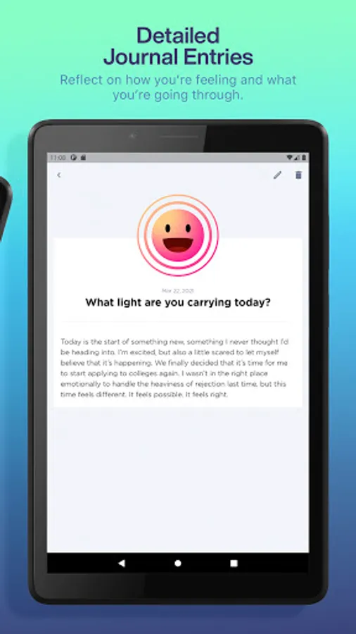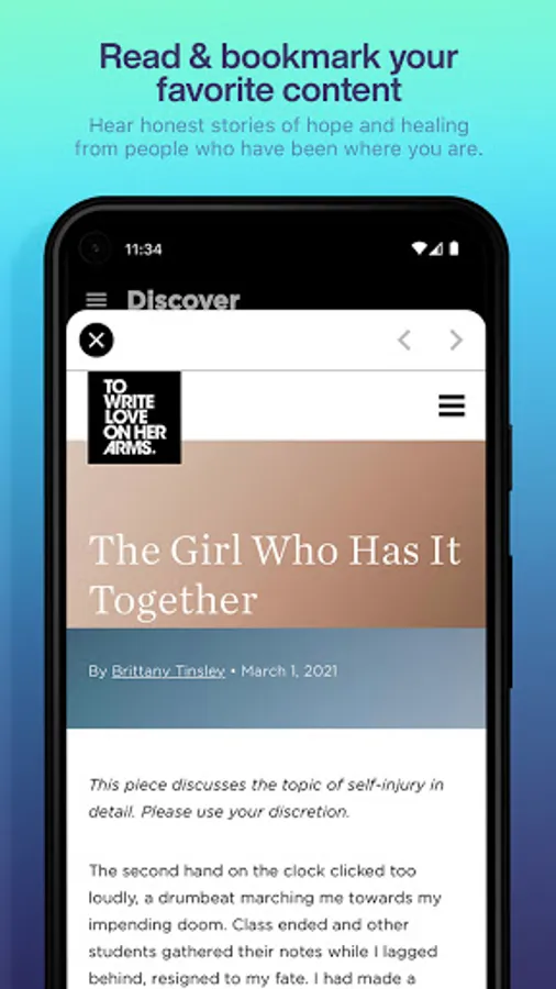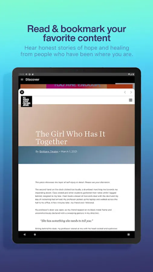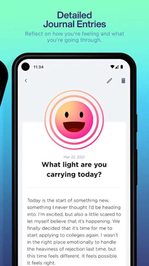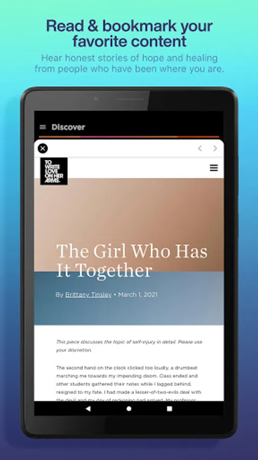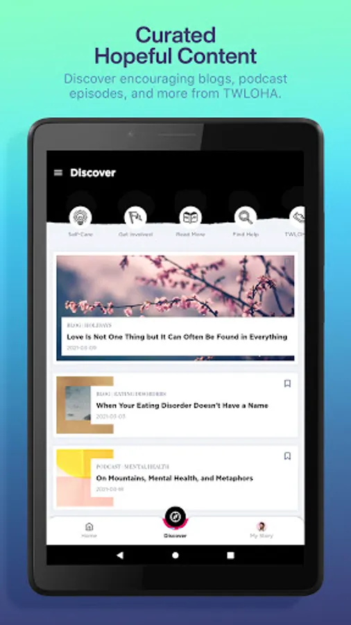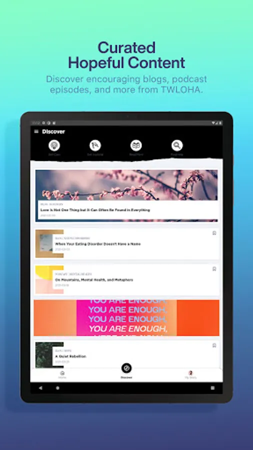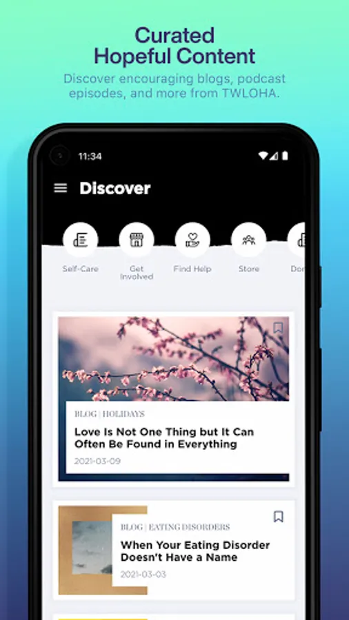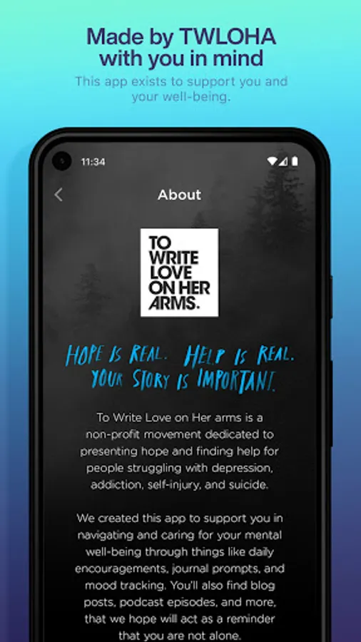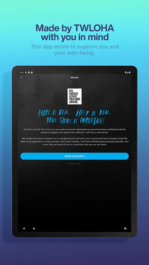 Daily-use self-care app by To Write Love on Her Arms. The Hopeful features daily encouragement, journaling, and mood tracking. Explore and reflect on how you’re feeling and what you’re facing through writing prompts, recording your emotions, and receiving encouraging words and inspirational quotes that you can share on social media. The app also features curated blog posts and podcast episodes that cover a variety of mental health topics such as depression, anxiety, addiction, living with diagnoses, healing trauma, and more.