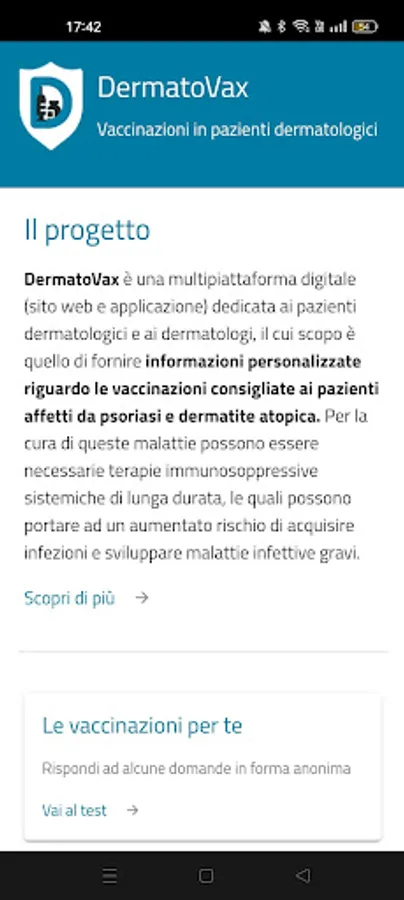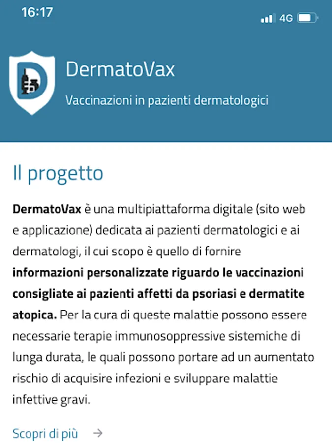 The application allows dermatological patients (adults) with psoriasis or atopic dermatitis and their dermatologists to have a specific consultation regarding the recommended vaccinations based on the therapy followed, age and other specific risk factors of the person. No sensitive data is collected and the use takes place anonymously. In addition to the basic functionality, the application allows you to consult information sheets on the main vaccine-preventable diseases and related vaccines, information on psoriasis and atopic dermatitis and access the vaccination centers in Italy. DermatoVax also exists as a website at the address www.dermatovax.it where an area dedicated to dermatologists is reserved with scientific material on the subject and the possibility of getting in touch with medical specialists in preventive medicine.