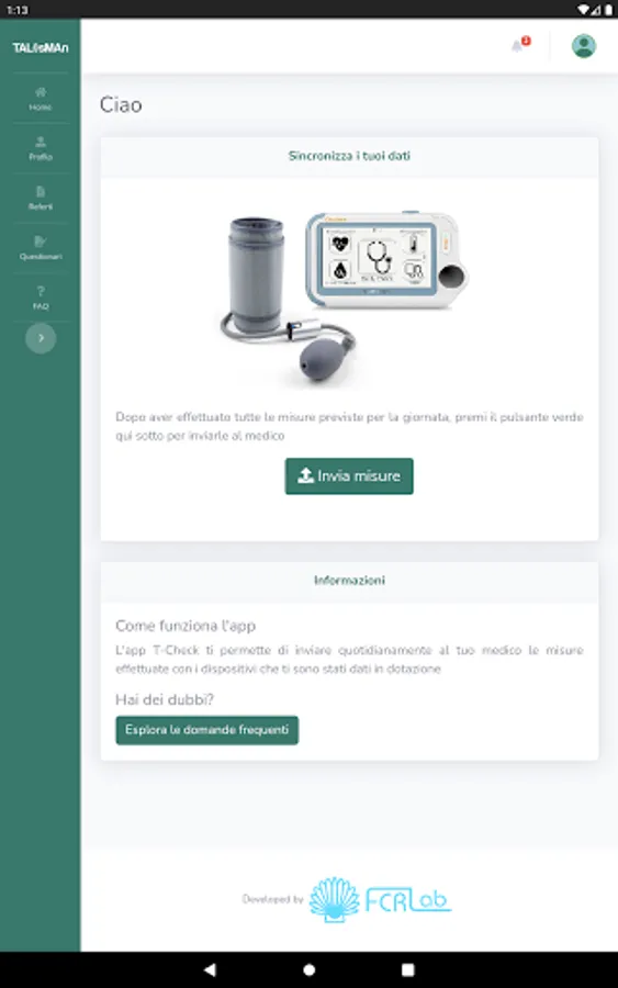 T-Check is an app developed by the FCRLab research group of the University of Messina as part of the PON TALIsMAn project for the collection of health data from remote monitoring devices. Personal and particular data are processed in compliance with the legislation on privacy and the principles of correctness, lawfulness, transparency and protection of privacy and individual rights.