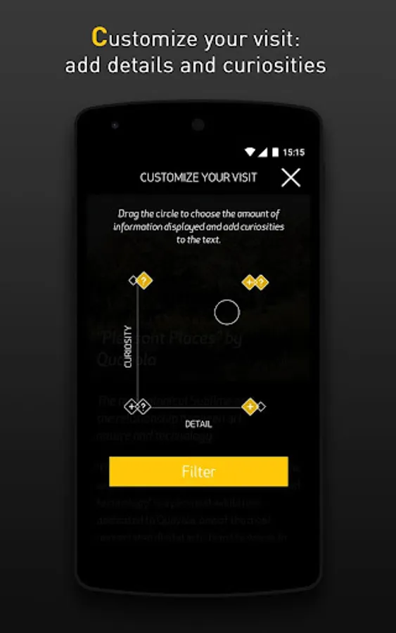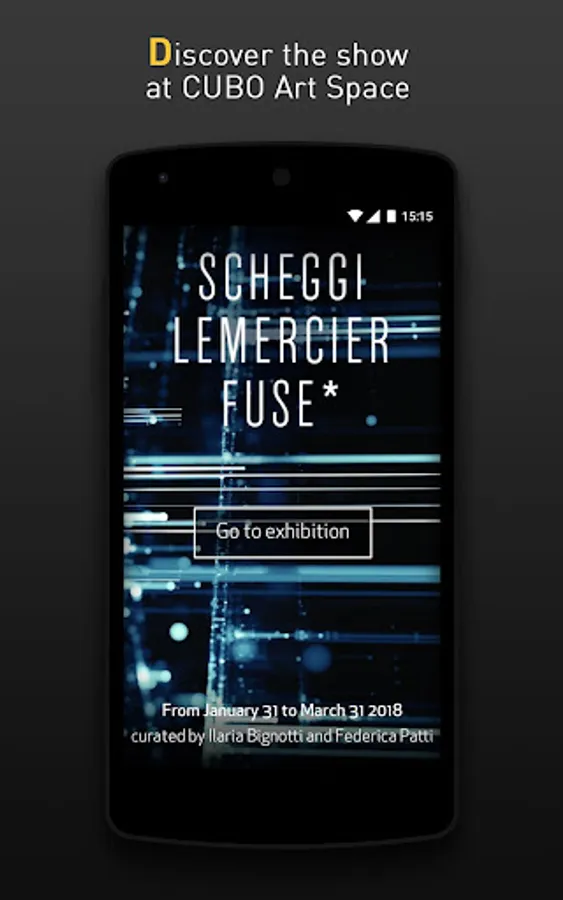 The new application guides you through the current exhibition at Spazio Arte inside CUBO, Centro Unipol Bologna. Thanks to the app you will find out details and curiosities about the exhibition, the artist and his work. Customize your discovery journey and browse through additional information, using the filter to set the level of detail.