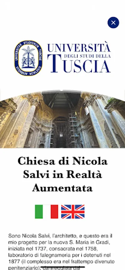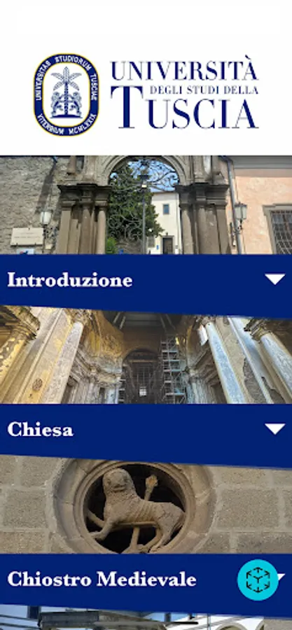 The app is an always active info point that allows you to access multimedia information content regarding the University of Tuscia and its historical-cultural sections. Thanks to cutting-edge technologies such as Qr Codes, Augmented Reality and Virtual Reality, the user will be guided along a path that touches all the main nerve centers of the university complex, including the ancient Church of Santa Maria in Gradi, reconstructed using a 3D model, and the University Museum.