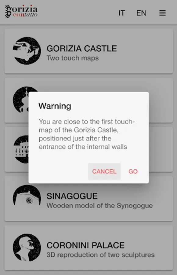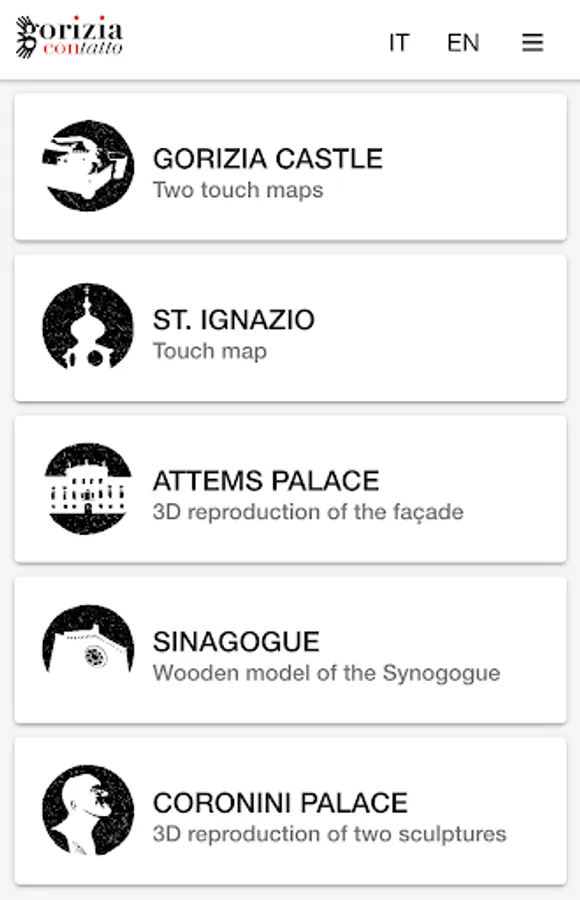 "Gorizia contatto" project aims to facilitate the accessibility to the cultural and artistic heritage of Gorizia to the blind and visually impaired people. The mobile app is part of the second phase of the project and it is developed to provide information regarding five sites included in an itinery proposed to the visitors.