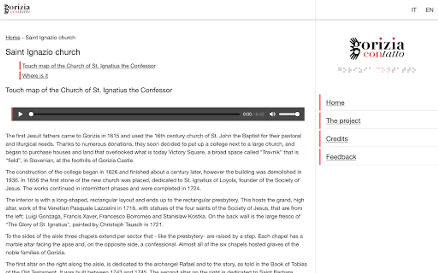 For each site the app offers a written and audible description, other than practical information about the site. The descriptions are associated to accessibility devices installed in the different sites.