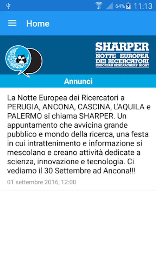 The EUROPEAN NIGHT OF RESEARCHERS in Perugia, Ancona, Cascina, Palermo and Aquila is called SHARPER - Sharing Researchers' Passions for Excellence and Results. An event that brings together the public and the research community, a party in which entertainment and information are mixed and create activities dedicated to science, innovation and technology and passion for research in general. SHARPER is an interregional project involving five cities: Perugia, Ancona, Cascina, Palermo and Aquila where activities will take place from the afternoon of September 28 until late at night and is co-funded by the European Commission within the framework of the Marie Curie Actions of the program Horizon 2020 GA633367.