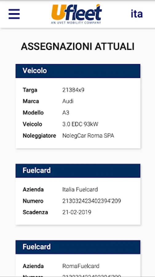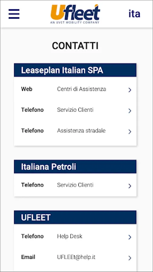 The driver will have the possibility to consult and view only the telephone numbers, assistance centers and location of the Service Point of the Lessor of his vehicle. If you also have a Fuel Card, the tanker's contact details will appear. It will always be possible to contact the dedicated UFleet number and e-mail address to forward any type of request.