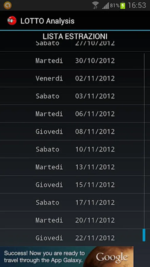 It is possible to scroll the list of extractions from 2001 to today (press and drag the blue cursor to the right to scroll the list more quickly) and by pressing on a line you go to the single extraction screen.